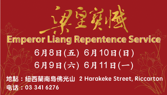 - FGS South Island New Zealand is a home for people to cultivate themselves. The Emperor Liang Repentance Service will be held from 8 – 11 June 2018 (Friday-Monday), as a means to bring safety and peace to the country, by providing merits to all beings, gaining wisdom and allowing our deceased ancestors to reach the pure land. We welcome all to participate in this Dharma service.