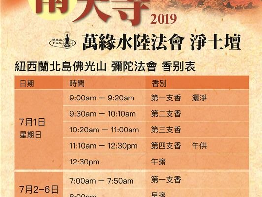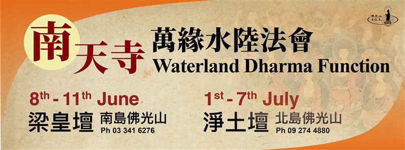 Waterland Dharma Function is the most solemn and biggest service among all Buddhism service. Its purpose is to transfer the merit to the deceased spirit, giving repentance chance for all beings, remembrance to the ancestor and also hoping for self-longevity and improving merit. FGS New Zealand will held the service during June and July, the Christchurch and Auckland will held the Emperor Liang Repentance Dharma Function and Seven days of Amitabha Recitation Dharma Function respectively. It gives the devotees to have a diligent cultivation and rise the Bodhi seed and communicate well with Buddha and Bodhisattva.