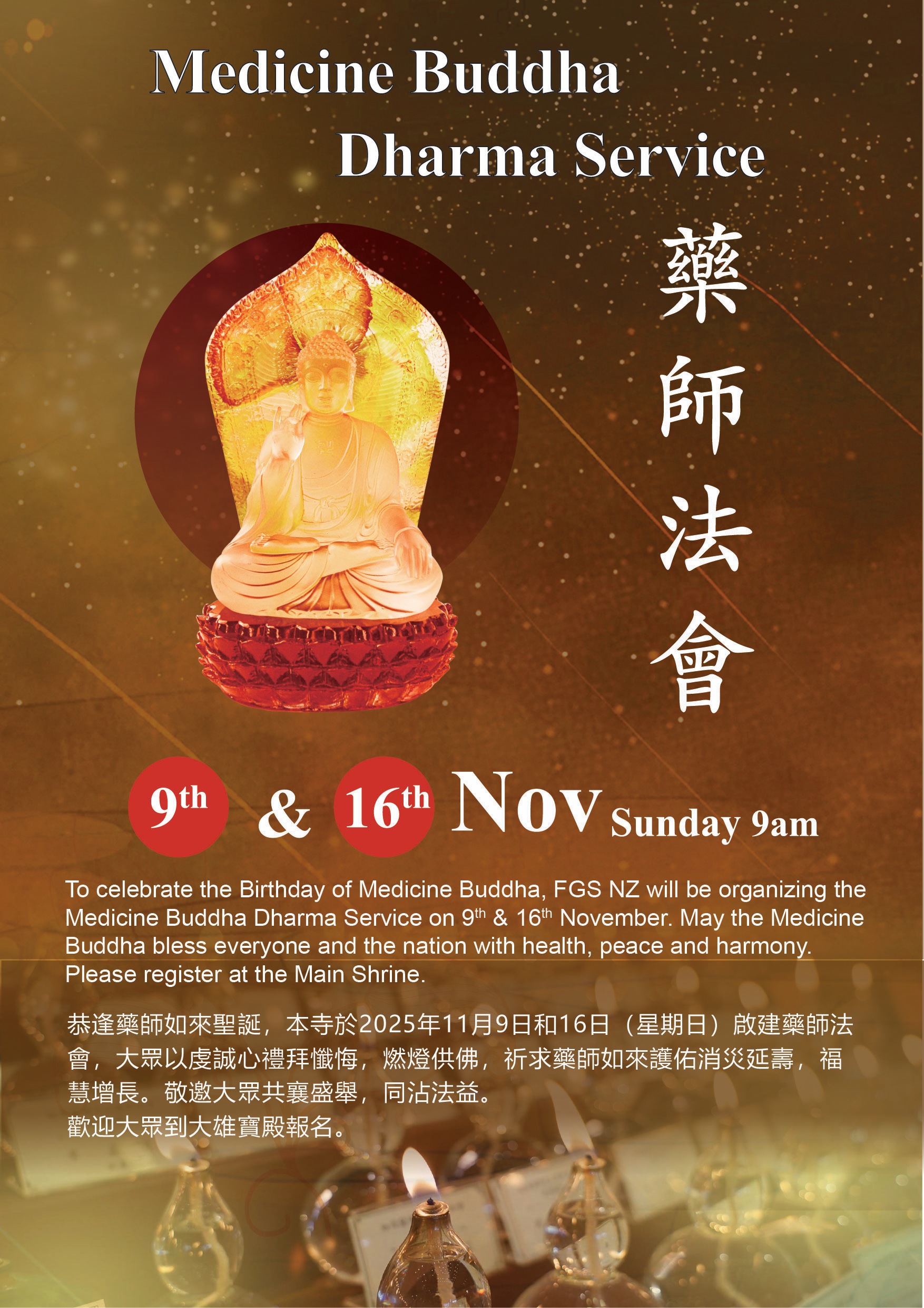 To celebrate the Birthday of Medicine Buddha, FGS NZ will be organizing the Medicine Buddha Dharma Service on 9th and 16th November(Sunday). This Service includes Paying Homage, an offering of light, repentance and recitation of The Sutra of Medicine Buddha and Medicine Buddha Treasured Repentance Text. Hope that the Medicine Buddha will bless all and the nation with health, peace and harmony.