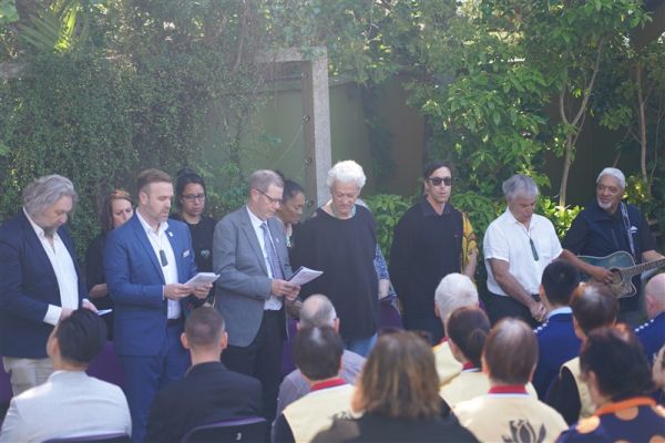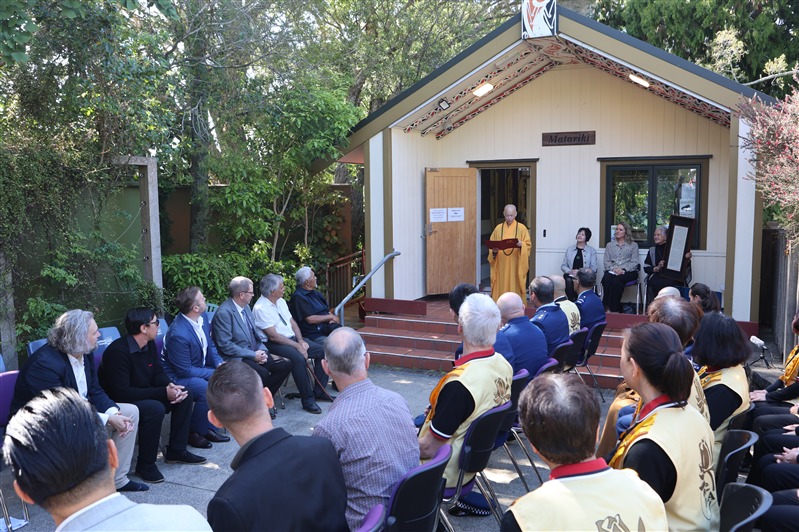 Ani Makea, the Auckland City Council’s Māori Marae advisor, opened the ceremony with a traditional karanga—a call to welcome—inviting guests into the spiritual space of the tribe and ancestors. Elder John Dobson addressed guests, guardians of the land, the Creator, ancestors and the Māori Queen, affirming that the enduring care and promotion of culture and education by Fo Guang Shan closely aligns with the values of Māori spirituality. He expressed hope to further deepen cultural ties through continued mutual respect, sharing and wisdom.