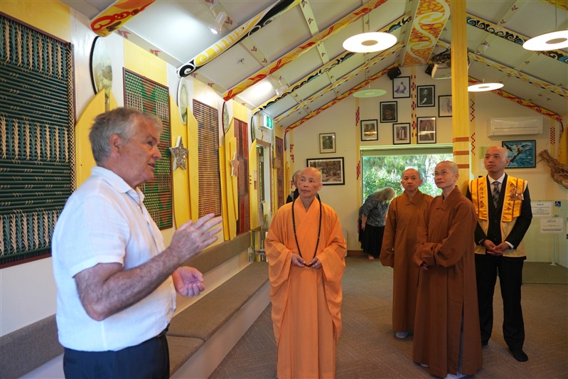 The ceremony concluded with the traditional hongi, the touching of noses, symbolising mutual respect and goodwill. A traditional Māori feast was hosted, signifying the strengthening of bonds and cultural unity. Elder Dobson led guests on a tour of the Marae, sharing stories of tribal history and heritage. Elder Taini Drummond also brought out a treasured artifact from their museum, a Buddha’s Footprint gifted by Fo Guang Shan 20 years ago. She remarked that this welcome ceremony is an experience of mutual witnessing, mutual respect and mutual achievement, infusing this multicultural land of Aotearoa New Zealand with more warmth, compassion and hope.