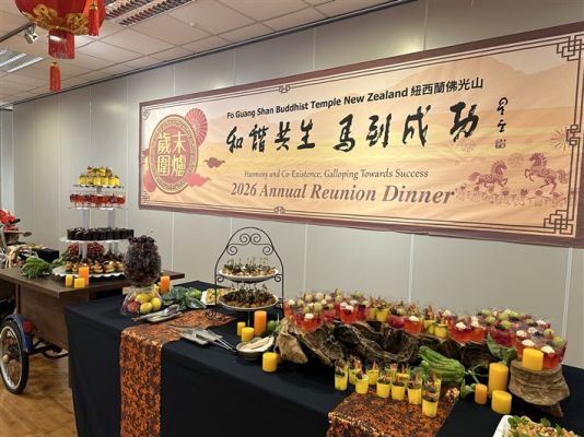 On 7th February 2026, FGS Buddhist Temple Auckland held its annual Reunion Dinner. Led by Abbess Manshin of FGS NZ, the event welcomed distinguished guests including MP for Takanini Rima NAKHLE, Director General Kendra CHEN of the Taipei Economic and Cultural Office (TECO) in Auckland, List MP Nancy LU, Shift Commander Inspector Anson LIN of Northern Communication Center, Howick Local Board member Damian LIGHT & Adele WHITE, Associate Professor Zhubin XIE from Northwest University China and doctoral student Xinyu ZHAI. They joined more than a hundred BLIA members, including President Evelyn KU of the BLIA North Island Chapter, Chief Advisor Lintao YU and advisor Sally WONG, for a warm reunion dinner.