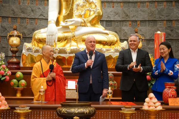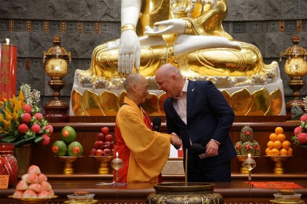 Abbess Manshin of FGS NZ presented the Prime Minister with a Spring Festival couplet in the calligraphy of the Founding Master of FGS Buddhist Order, Venerable Master Hsing Yun, reading Harmony & Coexistence, Galloping Towards Success, as well as an alms bowl symbolising a field of blessings. The Abbess wished the PM peace of mind amid his busy work, encouraging him to maintain inner ease and a joyful, harmonious spirit, and expressed hopes for national prosperity and public well-being.