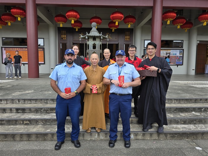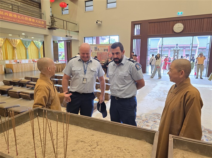 Amid their busy schedules, Counties Manukau East Area Commander Inspector Rodney HONAN and Sen Sgnt Simon CORNISH visited the Temple to ensure safety at the site. Abbess expressed gratitude to the Police team for safeguarding the auspicious celebration and supporting community safety.