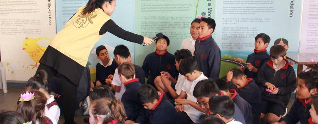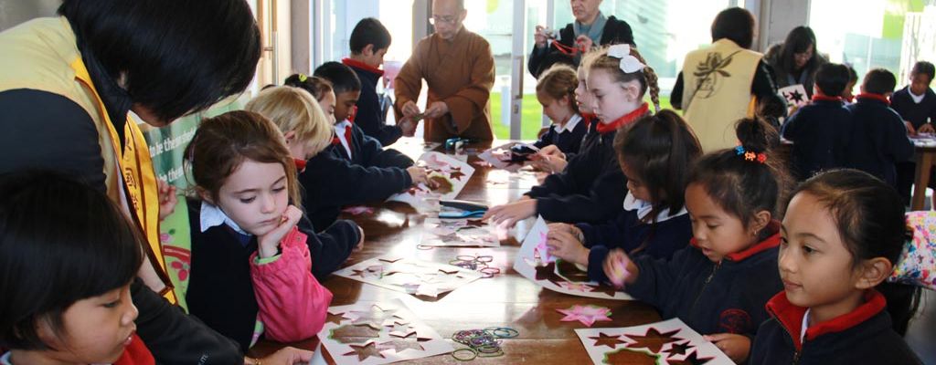 The abbess showed the lotus hand sign and greeted “We welcome you” following with “Auspicious Greetings” which is pronounced as “Ji Xiang” in Chinese. Deputy President Ding then introduced the meaning of “3 Goodness and 4 Giving” and how to put it into their daily lives following with a tour of the building. Fo Guang Yuan Art Gallery Christchurch coordinator Vicky Han then shared stories of Prince Siddhartha, Bathing the Buddha and explained the meaning “I am the Honoured One” followed by folding lotus origami and getting 3G4G water tattoos.