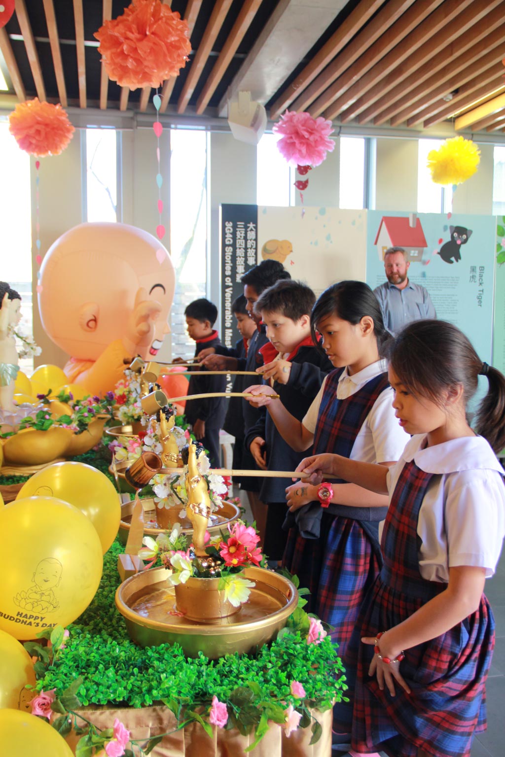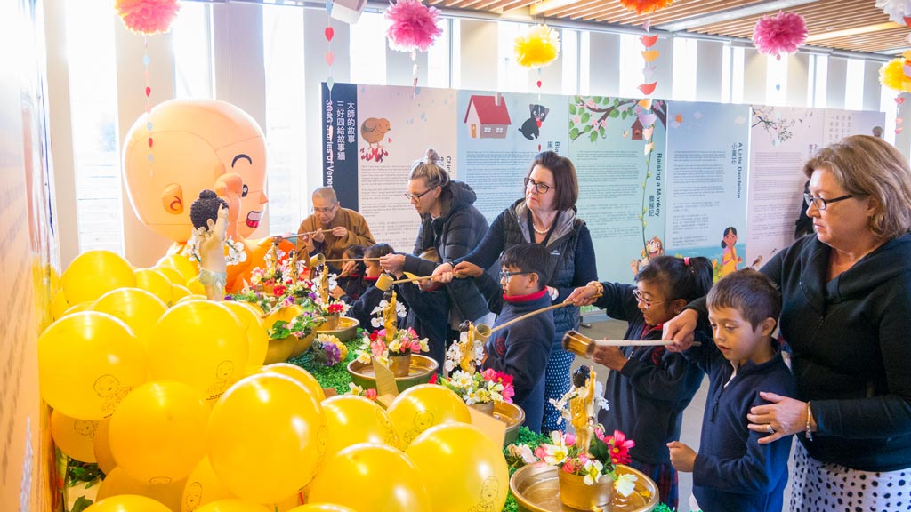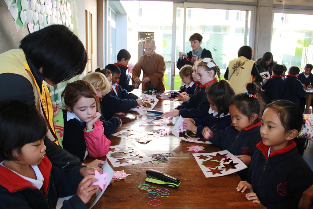 The abbess showed the lotus hand sign and greeted “We welcome you” following with “Auspicious Greetings” which is pronounced as “Ji Xiang” in Chinese. Deputy President Ding then introduced the meaning of “3 Goodness and 4 Giving” and how to put it into their daily lives following with a tour of the building. Fo Guang Yuan Art Gallery Christchurch coordinator Vicky Han then shared stories of Prince Siddhartha, Bathing the Buddha and explained the meaning “I am the Honoured One” followed by folding lotus origami and getting 3G4G water tattoos.