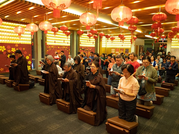 Temple Minister in Charge Venerable Jue Xi led devotees to recite the The 88 Buddhas’ Great Repentance Verses and Venerable Master Hsing Yun’s Prayer for Chinese New Year. The audience watching the video of Chinese New Year greetings by Venerable Master Hsing Yun and Most Venerable Xin Bau. They wished the Buddha, Master Hsing Yun, FGS Venerable Abbot Xin Bau and FGS NZ Venerable Abbess Manshin well for the New Year. On behalf of the temple, Venerable Jue Xi presented red auspicious packets and buns to the devotees, as well as Master Hsing Yun’s One Stroke Calligraphy couplet with the phrase – Cultivate a Heart that Blooms in All Seasons.