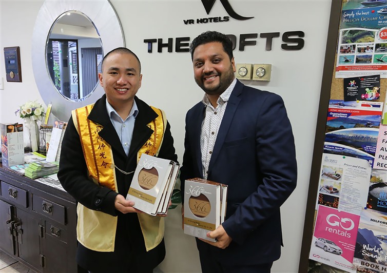 Christchurch resident Nick Henshaw came across Venerable Master Hsing Yun’s 366 Days with Wisdom book last Christmas at a hotel he stayed in during a vacation on the West Coast of South Island. After reading the book, he found the content to be very good and inspiring, so he looked around for where to get the book. After months of searching, he finally found out that he could purchase it from Fo Guang Shan (FGS) South Island temple, and so on 14th April after work, he came to the temple for the book.