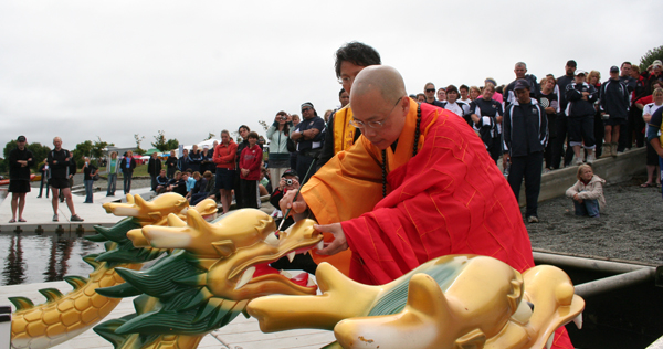 On 21st of February, the Aoraki Dragon Boat Association of Christchurch New Zealand held a series of dragon boat competitions at Avon River. 3 months ago, President of the Association Ms. Meri Gibson wrote a letter inviting Venerable Abbess Manshin to inaugurate the Dragon Boat Competition by conducting an eye dotting blessing ceremony for the six newly bought dragon boats from China.