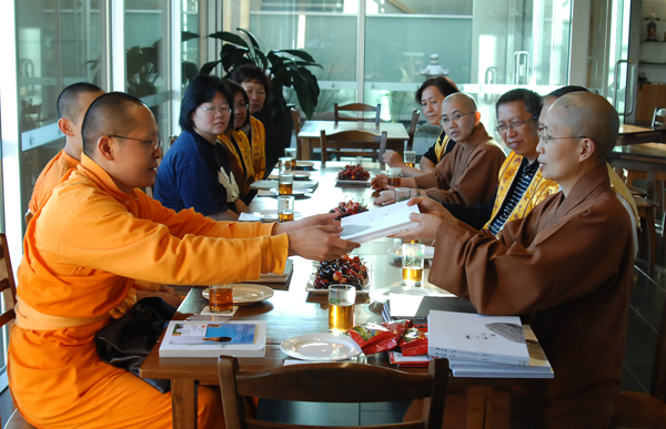 Venerable Juexi passed on Venerable Abbess Manshin’s regards, and on behalf of the Temple, presented the guests with copies of “Southern China’s Human Resources Weekly”, the North and South Island BLIA Activities Report, “Way of Life” and the 2010 Calendar of FGS New Zealand; Venerable Zhiyu of Dharmakaya Temple also shared in the spirit of giving, and gave the Venerables of FGS a copy of “The Sun of Peace”.