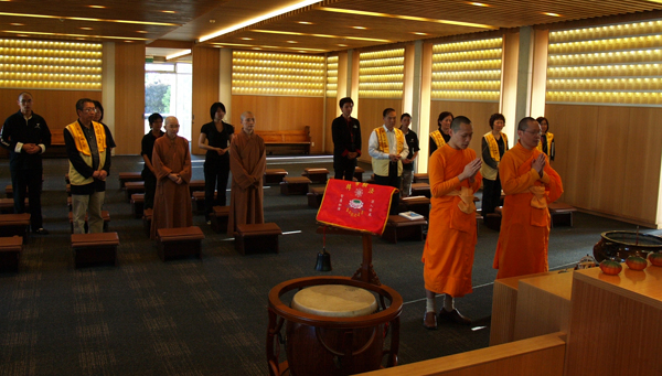 Engaging in a relaxed conversation, the Venerables exchanged their experiences of promoting Buddhism overseas. Venerable Zhiyu encouraged the volunteers to be industrious in serving their faith. He also shared his experiences of attending Buddhist College at FGS headquarters five years ago, praising FGS monastics for carry out the duty of Dharma propogation with dignity and excellence.