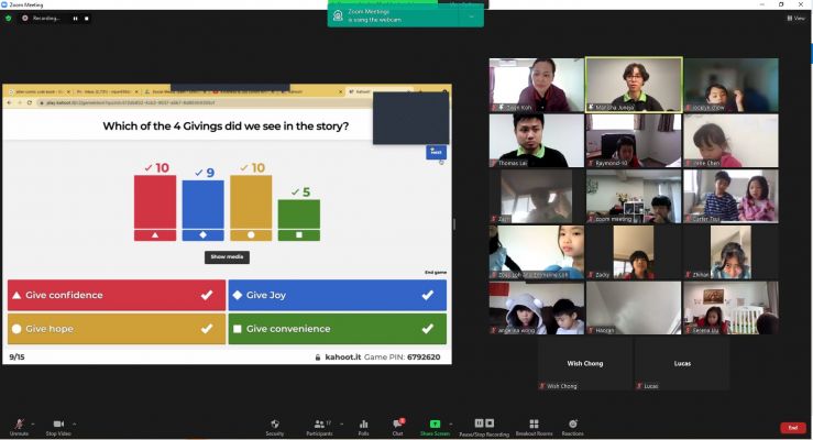 Next, Manisha shared an interesting YouTube video entitled “Kindness and Joy” to emphasise the importance of helping others. The session was then wrapped up by online interactive tools such as Kahoot!. The children felt excited and engaged. This enabled them to understand the moral values from the video easily by including some prompting questions. Wendy, John’s mother, shared that “John enjoyed the Kahoot session and loved the story. John realised that Joy (a character in the video) was being helpful, and he likes to become a person like Joy.”