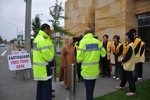 紐西蘭皇家警察警監Wallace Haumaha、警官Rakesh Nando、Justine Jheng等一行4人於25日前來紐西蘭佛光人賑災服務中心,熱切關心南島佛光山震後災情,紐西蘭佛光山住持滿信法師、南島佛光山監寺覺西法師和10名佛光人接待。住持感謝警監的關心,說明道場建築結構堅固,除一些物品在地震中震碎外,建築物和人員安然無恙,並於23日開始投入賑災工作,發放醫療物品與提供免費熱食給予災民和提供一個可以轉換能量的地方;同時邀請忙著在災區賑災尚未有時間用餐的警監Wallace Haumaha等一行一起用餐。