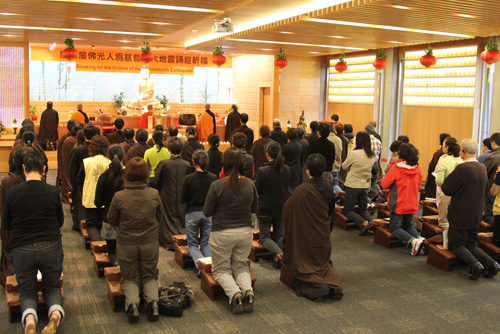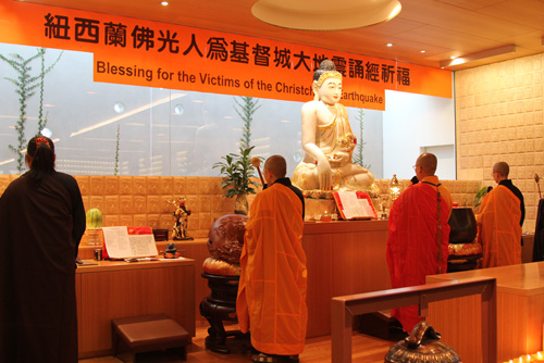紐西蘭南島佛光山於2月25日晚間7時舉行「紐西蘭佛光人為基督城大地震誦經祈福」法會。共有70餘位佛光會員、信徒在紐西蘭佛光山住持滿信法師帶領下為基督城地震居民祈福。法會結束後,住持為大衆開示表示近幾年的天災不斷上昇,使人招架不住,連被稱爲淨土的大洋洲都被水災和地震侵襲。