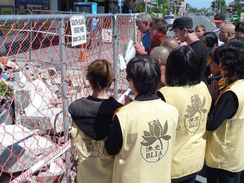 住持滿信法師帶領十餘位佛光人在現場為亡者誦經,家屬十餘人難過地痛哭流淚,佛光人介紹同樣在Riccarton Rd南島佛光山的道場,請家屬前往道場參加法會為亡者超薦,並從賑災服務中心準備熱騰騰的熱飲、餐盒及水果送給仍在肇事地點守候的家屬,並贈送手珠及佛像,希望他們內心有所依靠,家屬流淚感謝佛光人的關心,幾日來的傷痛終於可以稍獲舒緩。