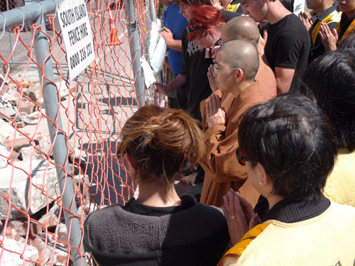 紐西蘭南島基督城2月22日大地震後的第五日也就是26日傍晚,紐西蘭佛光人賑災服務中心的團隊一行8人在住持滿信法師的帶領下,前往基督城Riccarton路上關心災情。經過數日的整頓,路上許多店家已經陸續開門營業,寂靜的基督城慢慢恢復生機。在Riccarton Rd與Deans Avenue的圓環邊有一棟因地震而嚴重倒塌的房屋,在禁止進入的圍籬上掛著數把鮮花,一行人靠近瞭解情況,原來是有人在此罹難。守候在一旁的罹難者家屬說明災情:亡者是74歲的Ross Bush是有名的砌磚工人,平日是這家已經倒塌的烘培店的常客,地震的當天應該是前來買麵包,結果車子一停靠就被整片倒塌下來的磚牆壓到而當場往生。