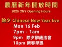 2026除夕 延生普佛 上開年香 「炮竹一聲除舊歲,迎春納福喜洋洋」。新春年節即將來臨,本寺於2026年2月16日啟建除夕辭歲延生普佛法會,祈願大眾平安吉祥,諸事圓滿,社會祥和,經濟穩定,世界和平。歡迎大眾回寺拈香禮佛,同霑法益。 活動日期:2026年2月16日 (星期一) 時 間: 晚9:00 普佛辭歲...[詳全文]地點: