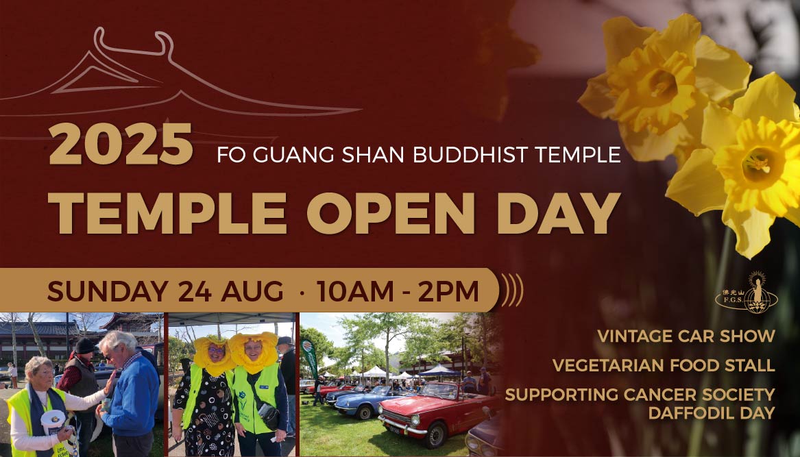 紐西蘭北島佛光山於2025年8月24日舉辦敦親睦鄰道場開放日活動,聯合多家古董車俱樂部特別舉辦為紐西蘭癌症協會募款活動,將三好四給的溫暖精神在社區中傳遞。當天也有素食攤位義賣,歡迎大眾踴躍支持。