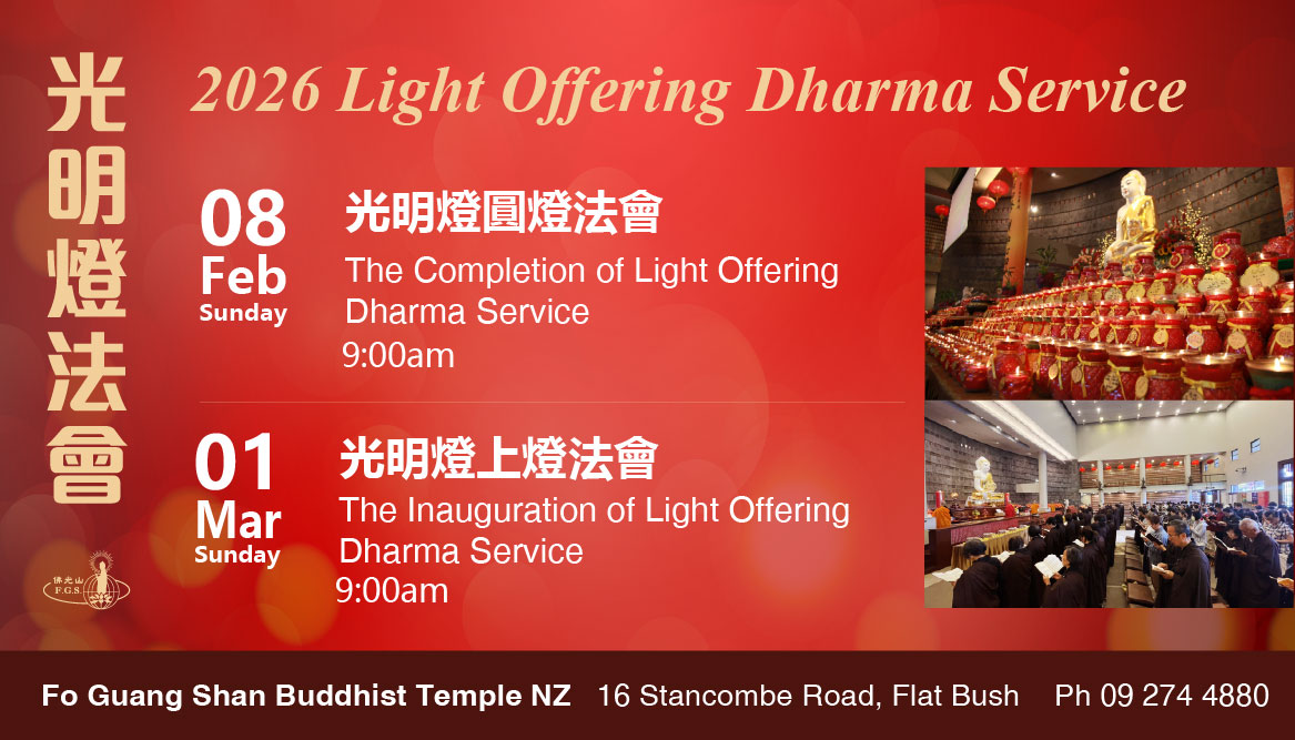 2026 紐西蘭北島 光明燈法會 02 月 08, 2026 光明燈圓燈法會 日期: 2026年2月08日 時間: 9am 光明燈上燈法會 日期: 2026年3月1日 時間: 9am 歡迎大眾到大雄寶殿為自己及家人點燈,祈願新的一年所求滿願。