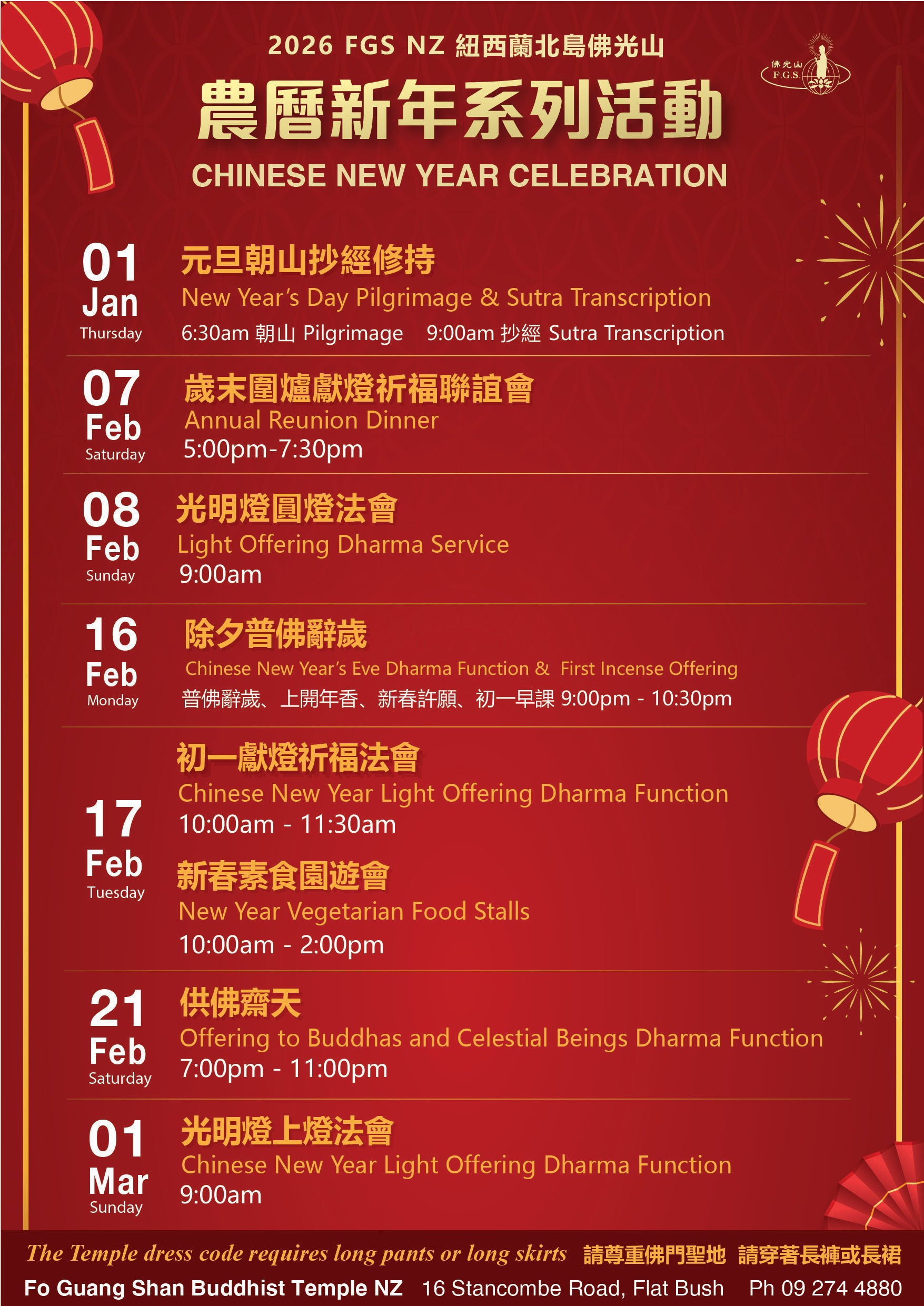 紐西蘭北島佛光山將於2026年2月8日舉行光明燈圓燈法會,為所有點燈的信眾作功德總回向,祈願大眾增福增慧。3月1日將為新的一年啟建光明燈上燈法會。