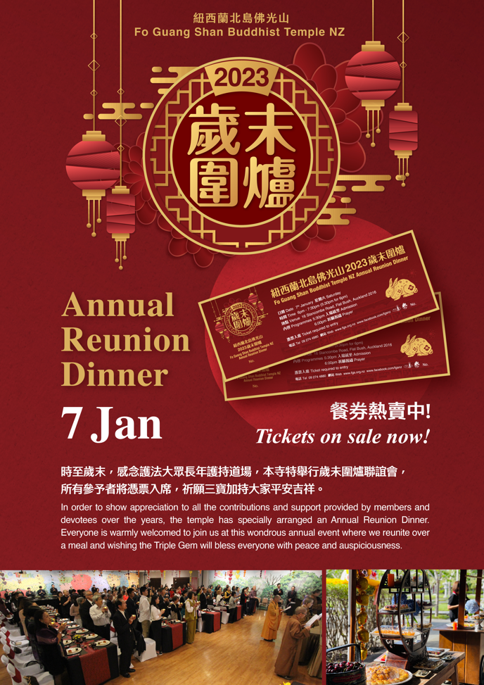 In order to show appreciation to all the contribution and support provided by members and devotees over the years, the temple has specially arranged an Annual Reunion Dinner. Everyone is warmly welcome to join us at this wondrous annual event where we are reunited over a meal and wishing the Triple Gem will bless everyone with peace and auspiciousness.