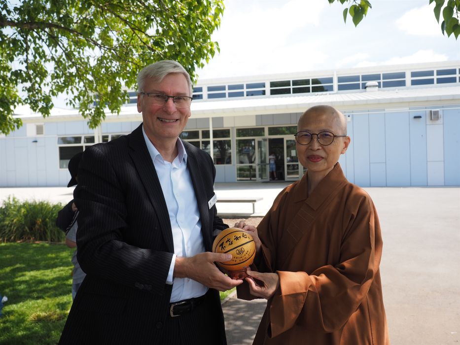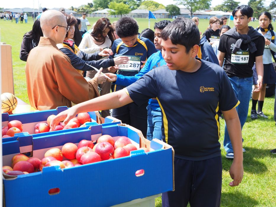 After the run, Venerable Juexi gave out apples to the participants and presented a Three Acts of Goodness BLIA Cup Basketball to the school as a token of appreciation. The basketball symbolized the BLIA Cup International Basketball Tournament held at the Headquarters of FGS, Taiwan. FGS New Zealand had sent two teams, both male and female to Taiwan in August this year to participate in the Tournament, and they both won third place. After hearing this, Principal Murray praised FGS for organizing such an event.