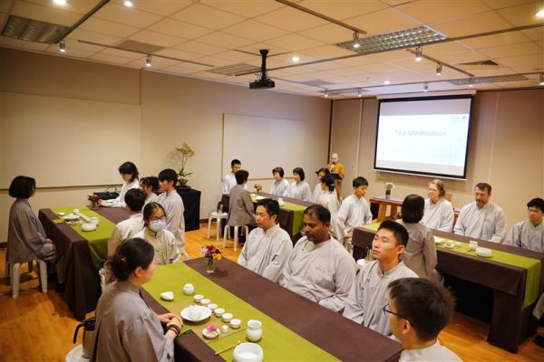 Venerable Miaoyu of FGS Auckland led participants in the Breath-Counting Meditation. The guidance helped attendees to gently release physical tension and quiet the mind, returning to a place of inner calm and stillness. YAD committees Edwin and Thomas introduced participants to formal meal etiquette, guiding them through mindful eating practices. This involved holding the bowl, observing the food with gratitude, and chanting reflection verses, fostering awareness and appreciation for every bite. During tea meditation, Venerable guided attendees to focus on the tea, appreciating its fragrance and drinking with awareness. This simple act allowed them to experience the depth of Chan, finding clarity and insight in each moment.