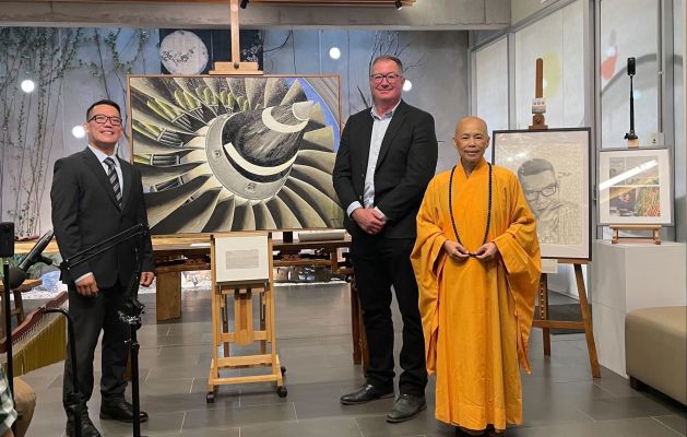 In her speech, Abbess Manshin quoted the teachings of Venerable Master Hsing Yun, the Founding Master of FGS: To cook delicious food, one must cook with heart. She remarked that this same spirit is upheld by the FGY Art Gallery, where every cup of coffee, every dish and every exhibition is presented with wholehearted dedication. Abbess also shared that Gary began painting at the age of three, revealing a natural talent and a continuation of past-life wisdom that brought warmth and inspiration to others in this life.