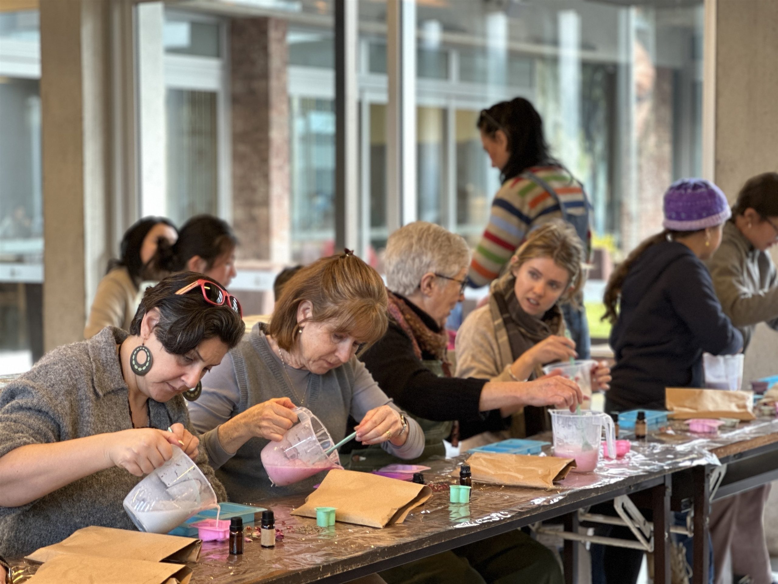 During the workshop, Anna demonstrated the soap-making process, including melting the soap base, adding essential oils, pouring into molds, stirring and allowing it to cool naturally. Once participants learned the basics and safety guidelines, they eagerly began crafting their own personalized soaps. From choosing essential oil fragrances to selecting molds and decorating with dried flowers such as lavender and roses, every step was filled with creativity and fun.