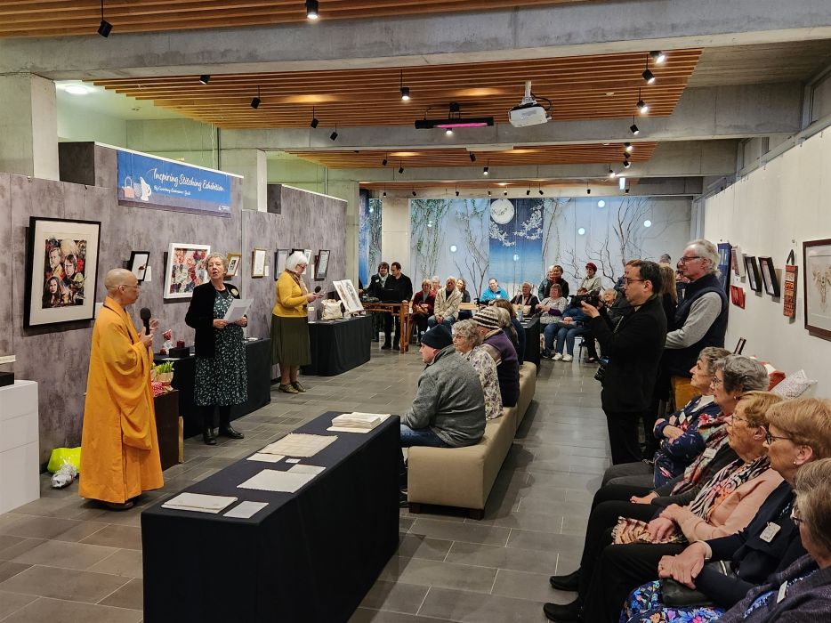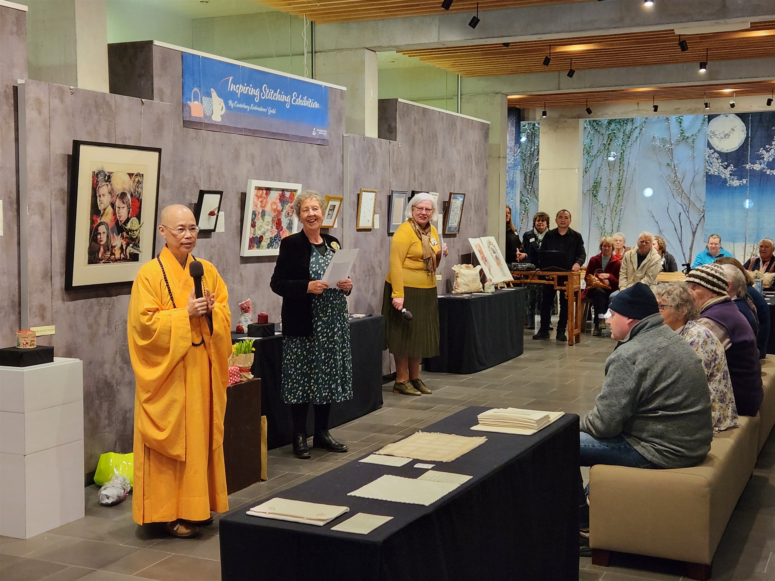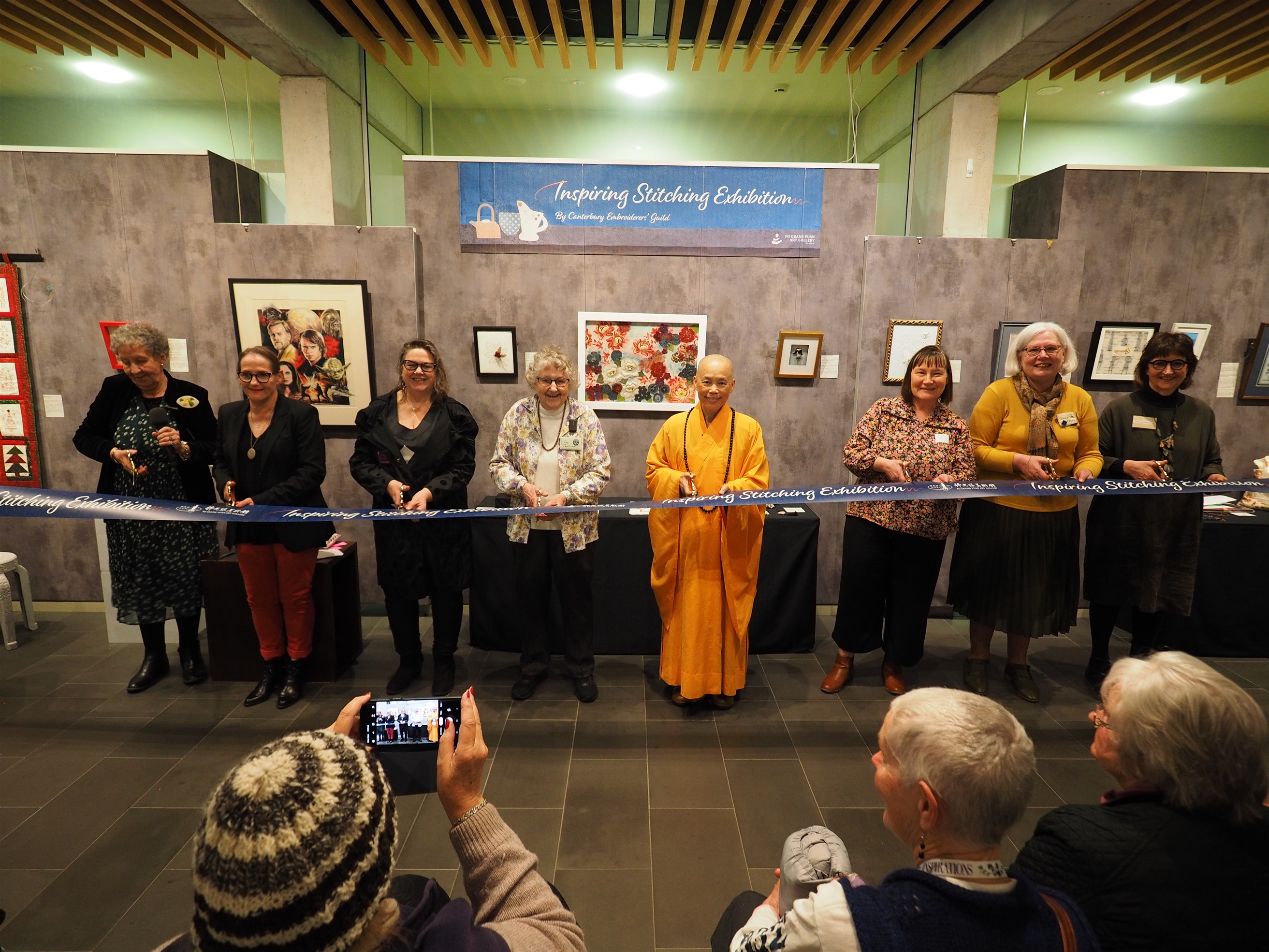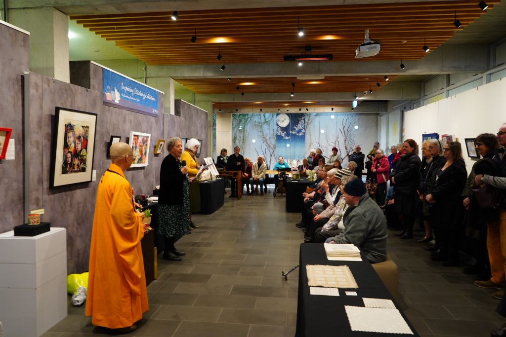 FGY Art Gallery Christchurch held an opening ceremony for the Christchurch Canterbury Embroiderers’ Guild’s Inspiring Stitching Exhibition on August 19. Distinguish Guests attended the exhibition included the Curator of FGY Art Gallery New Zealand, Venerable Abbess Mashin, Chairman of the Canterbury Embroiderers’ Guild, Diane, the Exhibition Coordinator, Marie Meyer, and nearly 100 people made up of members of the Canterbury Embroiderers’ Guild and members of BLIA South Island.