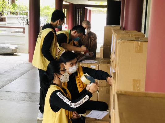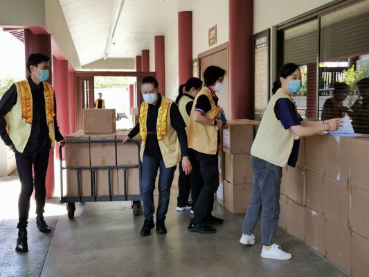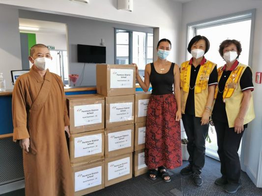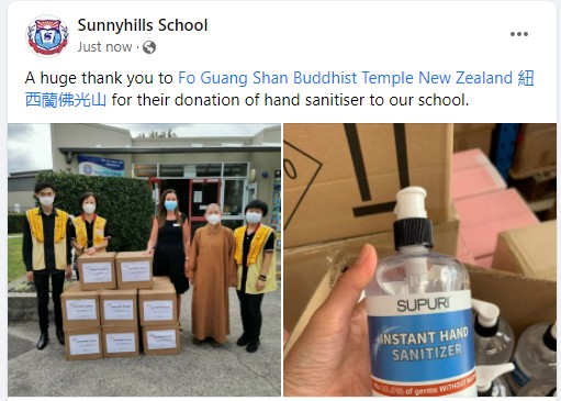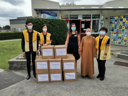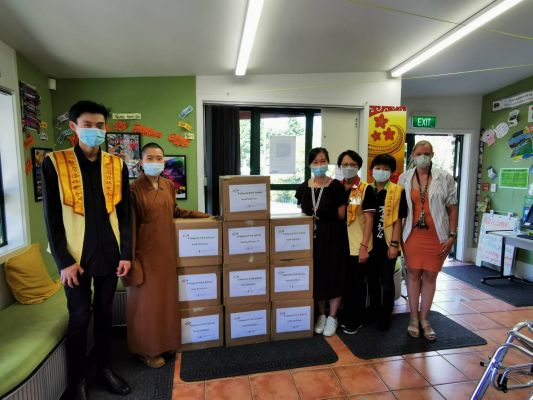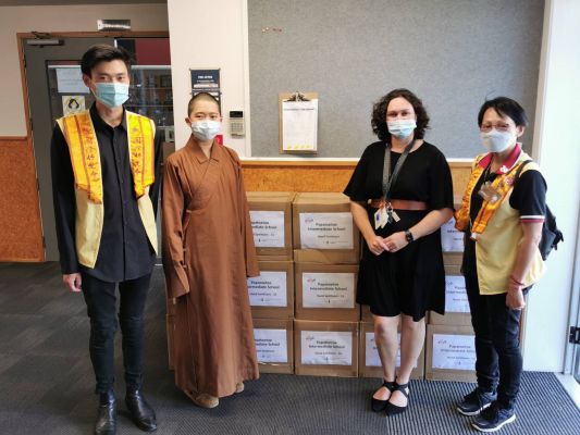 During the 17 and 18 February 2022, FGS Auckland received 160 cartons of hand sanitisers with 3840 bottles, which the FGY Art Gallery volunteer donated on behalf of Green Cross Health Distribution Ltd. The outbreak in Auckland is spreading rapidly, with thousands of new cases each day and many confirmed cases in schools. Abbess Manshin was concerned about community schools. Once the sanitisers arrived at the Temple, the team repacked with the school label on the boxes right away. The BLIA team Split into three groups to distribute the sanitisers to 12 schools according to the planned route, including Venerables, the temple team, President of BLIA North Island Yu-Lin Gu, committees and YADs.