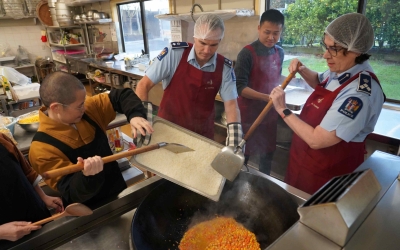 紐西蘭北島佛光山於2025年12月6日至7日舉辦年度「慶祝法寶節臘八粥結緣」活動,紀念釋迦牟尼佛於臘月初八在菩提樹下夜睹明星、證悟無上正等正覺的殊勝因緣。香積菩薩在監寺如廉法師的指導下,於清晨5點開始煮粥工作,從準備食材、掌控火候到分裝分送...
