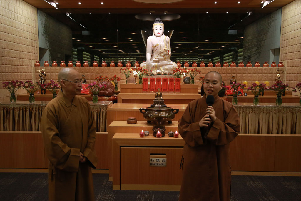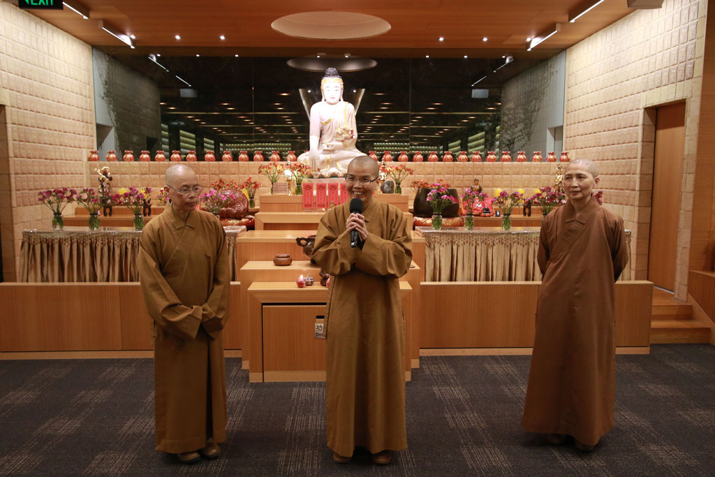 住持滿信法師開示佛法在人間,除了經懺佛事之外,藝術、食物、教育等都是實踐人間佛教。北島佛光山連續六年舉辦「三好四給文化節」,南島也連續兩年舉辦此活動都獲得很好的成果及迴響。住持同時也分享在366送書過程中的精彩故事及在嘉年華活動中精彩的影片,並感謝大眾對常住的護持。