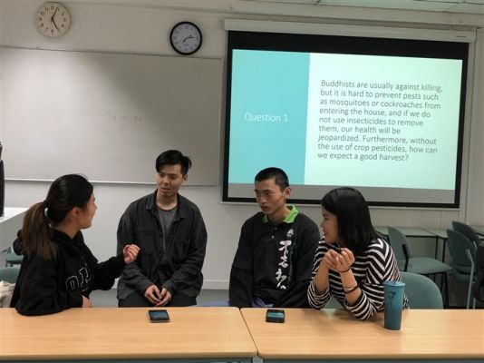 如廉法師首先引領大家進行數息禪修,鼓勵青年們可以每日晨起禪坐,感受呼吸、練習專注,能夠幫助改掉拖延的習慣。佛光社團幹部Roger導讀大師的著作並選取「我們可以殺害蟲嗎?」、「病菌也是生物,使用抗生素殺除病菌也算是殺生嗎?」、「世界上有鬼魂嗎?」等問題,引發青年們熱烈討論。