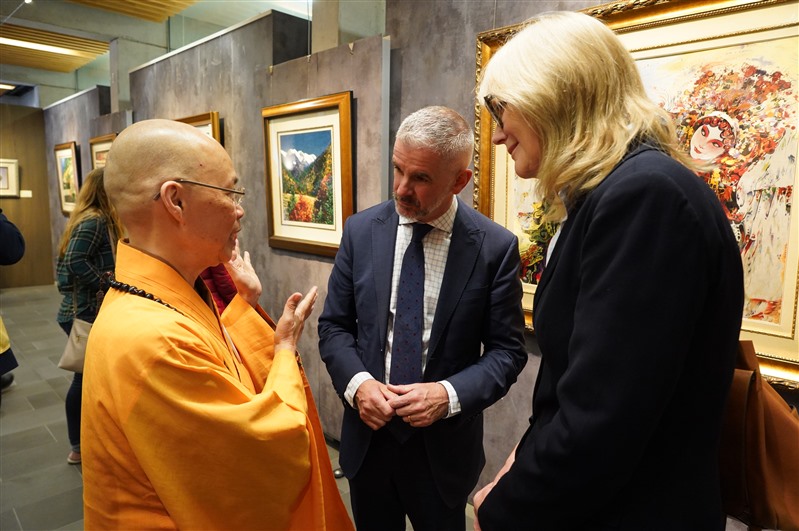 中國駐基督城領事館總領事汪志堅致詞表示「我很榮幸參加佛光山舉辦的姚紅英刺繡展開幕式,也很高興地看到有這麽多新西蘭朋友與我一道來欣賞中國的傳統刺繡藝術。蘇繡是中國非物質文化遺產,已有2000多年的歷史。經過歷代藝術家們的不斷開拓創新,形成了現在的技術和藝術風格,姚紅英女士是當代的傑出代表。今天能在新西蘭南島欣賞到姚紅英女士的作品,特別是全球新冠疫情還沒有得到有效控制的情況下,我要感謝佛光山為此次活動順利舉行所作出的努力。正是因為你們多年來的不懈努力,才讓南島的各族裔人群能夠像今天一樣有機會欣賞來自中國的文化藝術。感謝你們為促進中新文化交流和人民相互理解做出的重要貢獻!我相信,今天的展覽一定會給大家留下深刻印象。我也期待今後有機會來佛光山參加更多的文化活動。祝此次活動成功!」