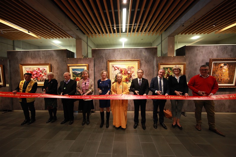 開幕式首先進行隆重的剪綵儀式,為「針繡風華—姚紅英刺繡展」掀開序幕。館長滿信法師致詞表示,等待11年的「姚紅英刺繡展」終於風華再現,呈現予基督城大眾。近年來基督城大眾經歷一些災難,需要注入歡喜色彩鼓舞人心。姚紅英女士的精心刺繡作品,展現了多姿多彩的藝術風貌,為基督城民眾帶來許多歡喜與希望,這也兌現了家師星雲大師將歡喜送給基督城大眾的心願。