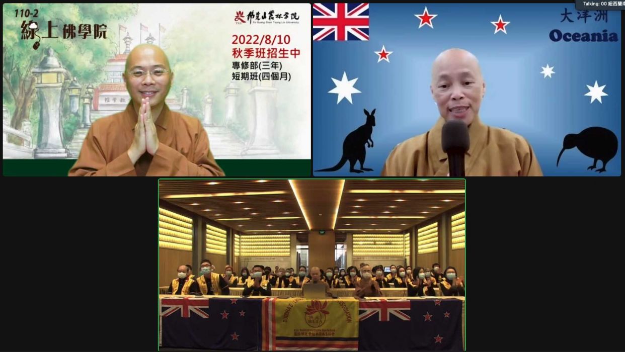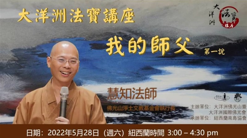 國際佛光會紐西蘭南島協會於5月28日,在南島佛光山舉辦線上大洋洲法寶講座「我的師父第一說」,邀請佛光山淨土文教基金會執行長慧知法師線上主講,紐西蘭佛光山住持滿信法師擔任主持人,監寺覺西法師、南島協會會長蕭文輝、幹部與會員、基督城大眾70人出席,大洋洲六個協會通過 You tube直播觀賞。