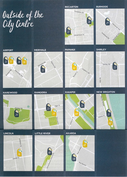 「彩繪企鵝」街頭藝術的參與者為藝術家及學校師生,為50隻大企鵝和70隻小企鵝雕塑進行彩繪裝飾。彩繪設計內容包含氣候、風土人文特色、生態環境等。每一隻企鵝雕塑附上告示板,提供企鵝雕塑身上的彩繪故事內容、彩繪者名稱及背景資料、雕塑品編號等。120隻「彩繪企鵝」分佈在基督城各區,足跡遍佈山上、海邊、港口、機場,甚至距離市中心80餘公里的阿卡羅阿小鎮。民眾可通過媒體或以手機下載相關軟體搜尋「彩繪企鵝」的蹤跡,成為觸動全民的益智尋寶遊戲!