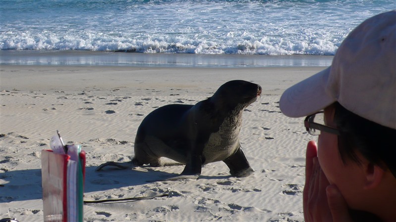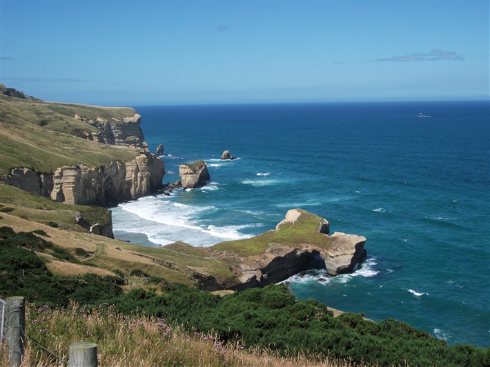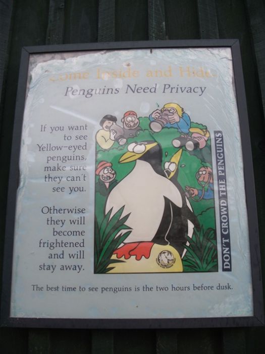 從Oamaru再往南下120公里,是南島第二大城市旦尼丁(Dunedin)。這裡是黃眼企鵝、海獅和皇家信天翁的棲息基地。在旦尼丁郊外的Sandfly 灣,是公開的野生動物保護區。有冒險精神的人要是敢闖入野生動物棲息所,會驚見躲在草叢後的黃眼企鵝正在給自己淨身;繼續往海岸線前進,還會看到剛遊上岸的海獅。海獅的視力非常好,遠遠看到岸上有人在走動,便會箭步往前追逐,不知情者見勢不妙當然拔腿就跑,可是人跑得越快,海獅卻追得越起勁!這時,會有野生動物保護員出現解圍,示意大家靜止不動;當海獅來到面前東張西望,發現沒有移動物體,自討沒趣就溜走。野生動物保護員解釋,當幼年海獅看到有移動的物體,以為是玩意兒便向前追逐;物體移動越快,海獅就會追逐得越起勁!