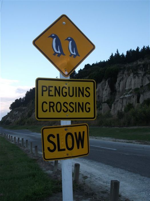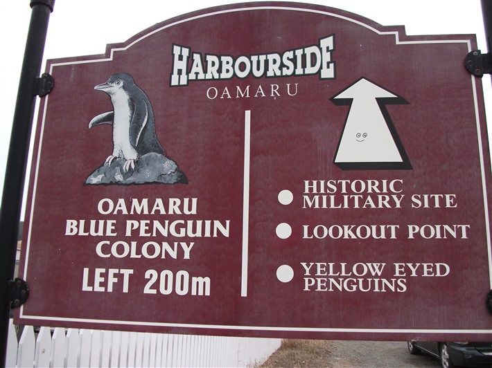 Kaikoura繼續往南下400餘公里,來到 Oamaru小鎮。進入鎮前,路旁有個顯眼的路標標示「企鵝過馬路,請慢駛」。原來這是世界上體積最小的企鵝–藍企鵝的棲息地。藍企鵝一般身高不到5厘米,從頭部到背部都是深藍色,因而得名。藍企鵝會在天黑後隨著浪花遊上岸,越過岸上的泊油路回巢歸家。有人刻意在碼頭守候,承受寒風刺骨的海風吹襲,為的是親眼見證傳聞中的「藍眼企鵝過馬路」。看著體型嬌小的藍企鵝躍上碼頭,搖頭甩腦、一拐一拐地經過自己的腳下,穿過柏油路回巢,逗趣的畫面令人禁不住尖叫:「太可愛了!」然而,觀者必須完全禁語,否則會把小小企鵝給嚇壞!幸運者還能親睹成群的藍企鵝穿過自己的腳下呢!