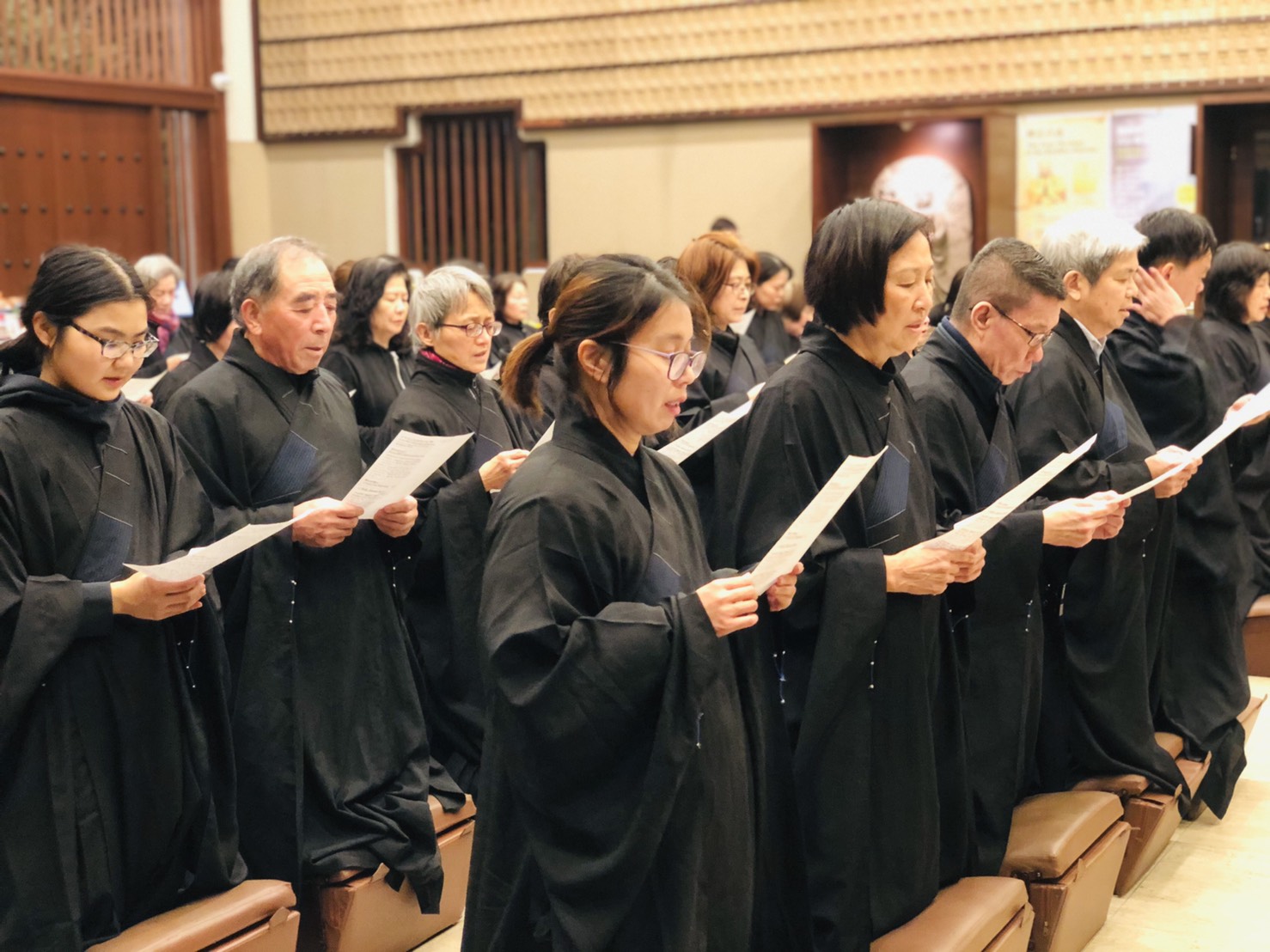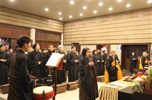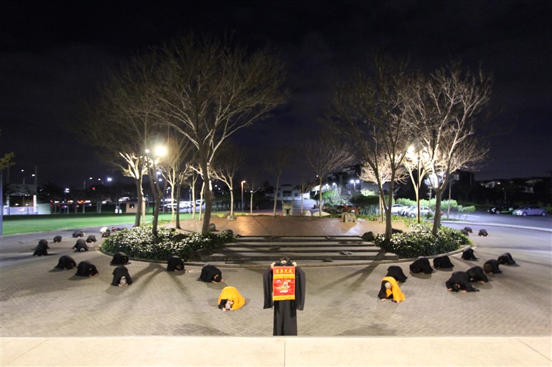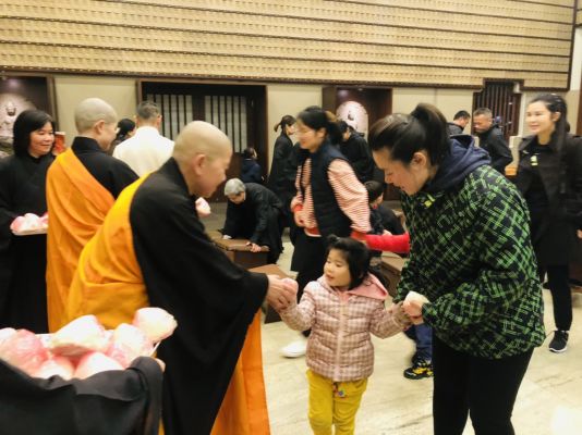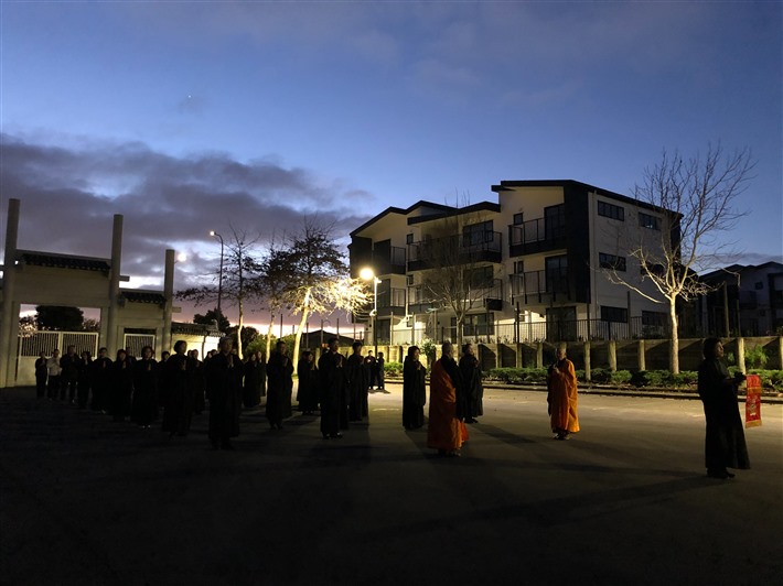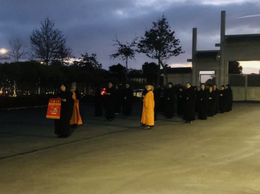 60餘位信眾於下午6點在如廉法師與妙禹法師的帶領,隨著稱念觀音菩薩聖號,從山門虔誠禮拜至觀音殿,莊嚴的朝山隊伍與虔誠的心意並未受到寒冷冬天天氣的影響,且感受觀音菩蕯慈悲攝受,以及堅定的信仰力量與法喜。