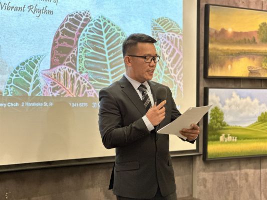 藝術家Gary表示他對樹葉的變化與色彩深感興趣,不斷創作的過程讓他思考沉澱,與世界對話。他特別介紹「V2500飛機引擎」畫作,象徵機遇與感恩,為17年前他與38位菲律賓航空工程師踏上紐西蘭土地的重要因緣。感謝佛光緣美術館二館團隊的成就,此次展出要獻給遠方的家人,也希望大眾在觀展時感受與大自然的連結與內心的寧靜。
