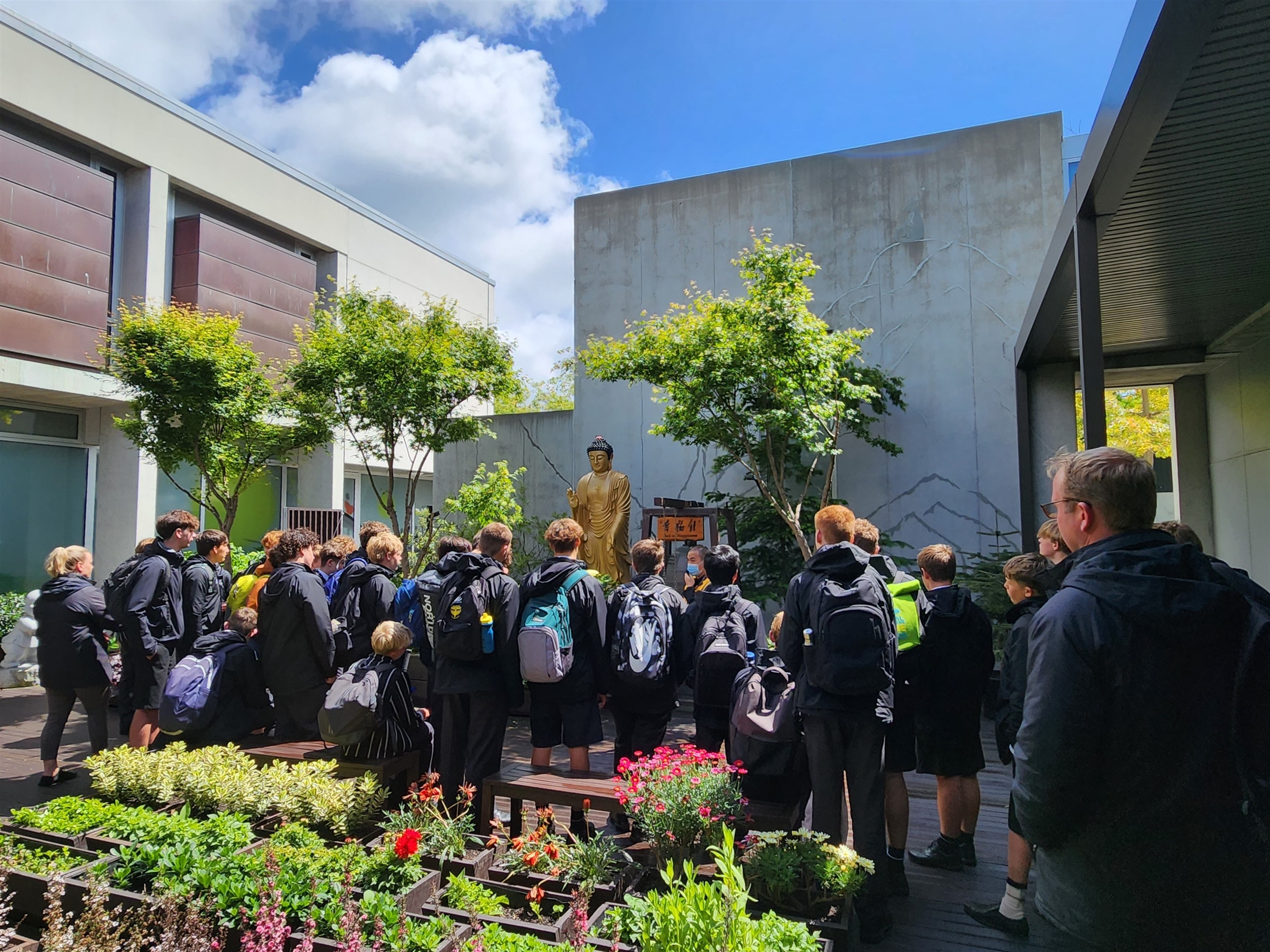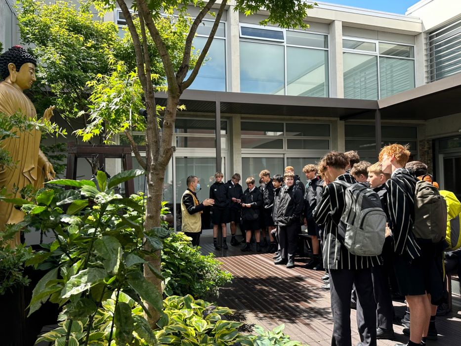 紐西蘭南島基督城貴族名校 Christ’s College的66位學生於11月22日及24日在Cameron Pickering 牧師及老師們的陪同下,從學校步行3公里至南島佛光山參訪,歡喜展開跨宗教文化之旅。
