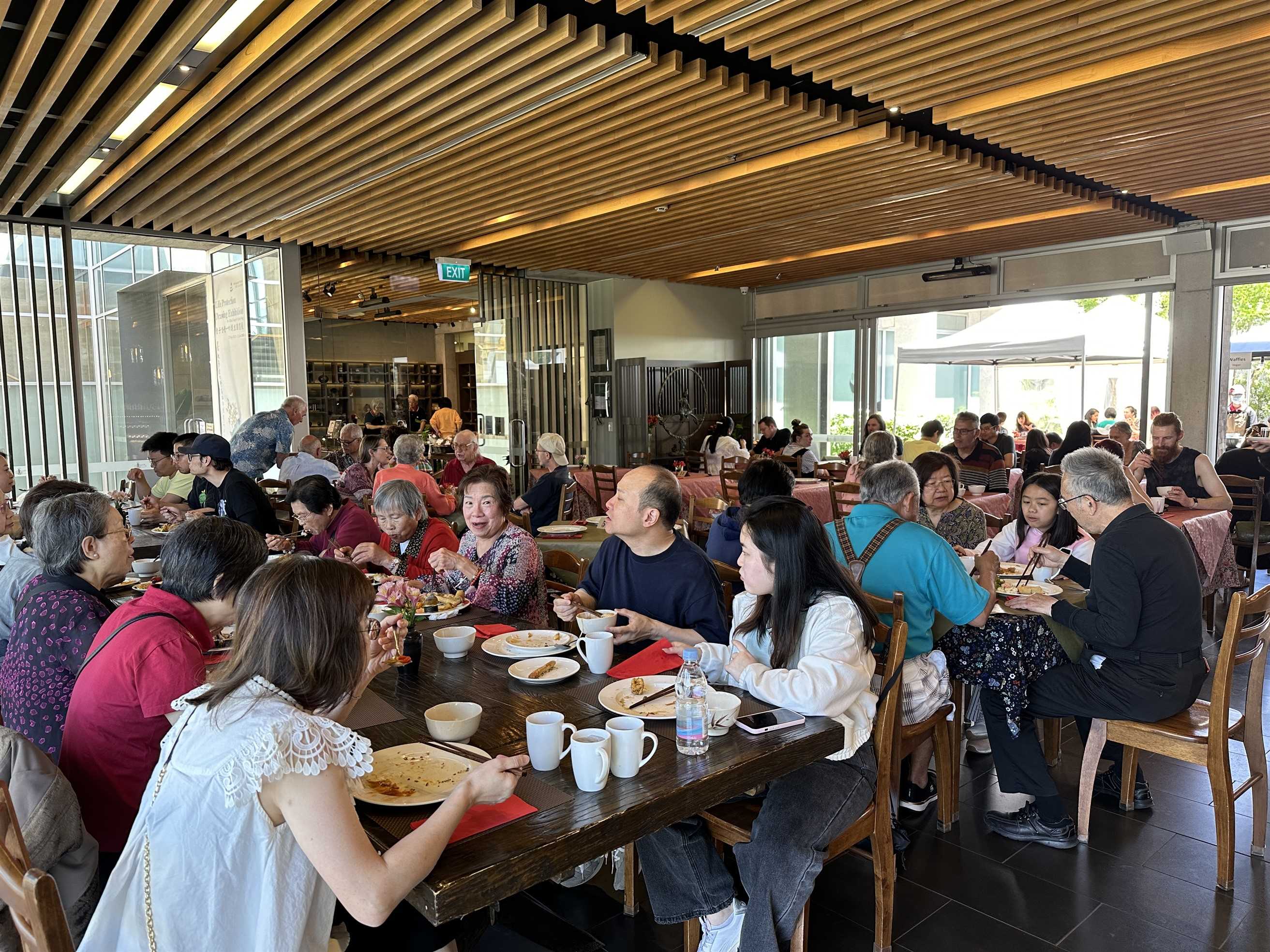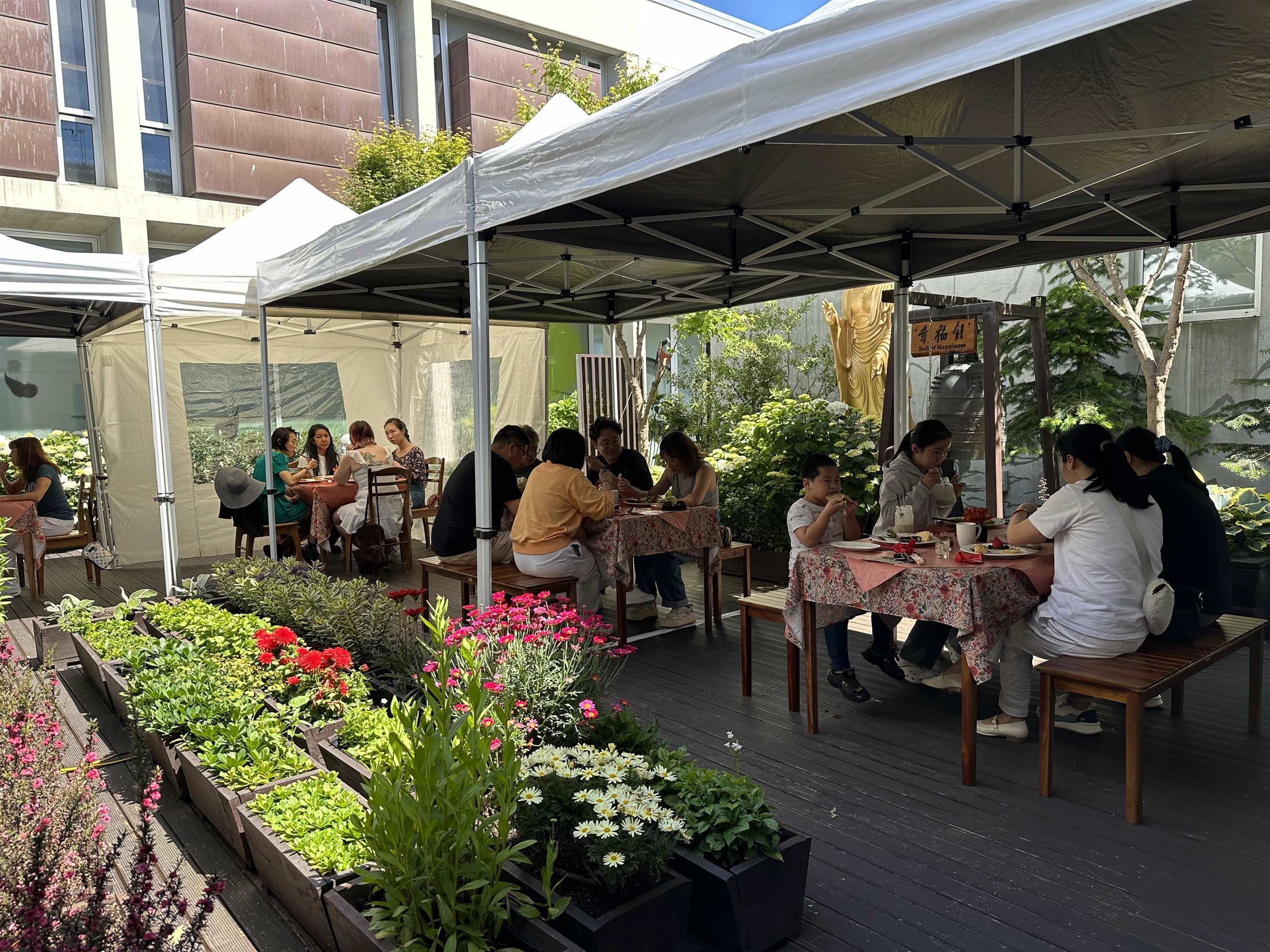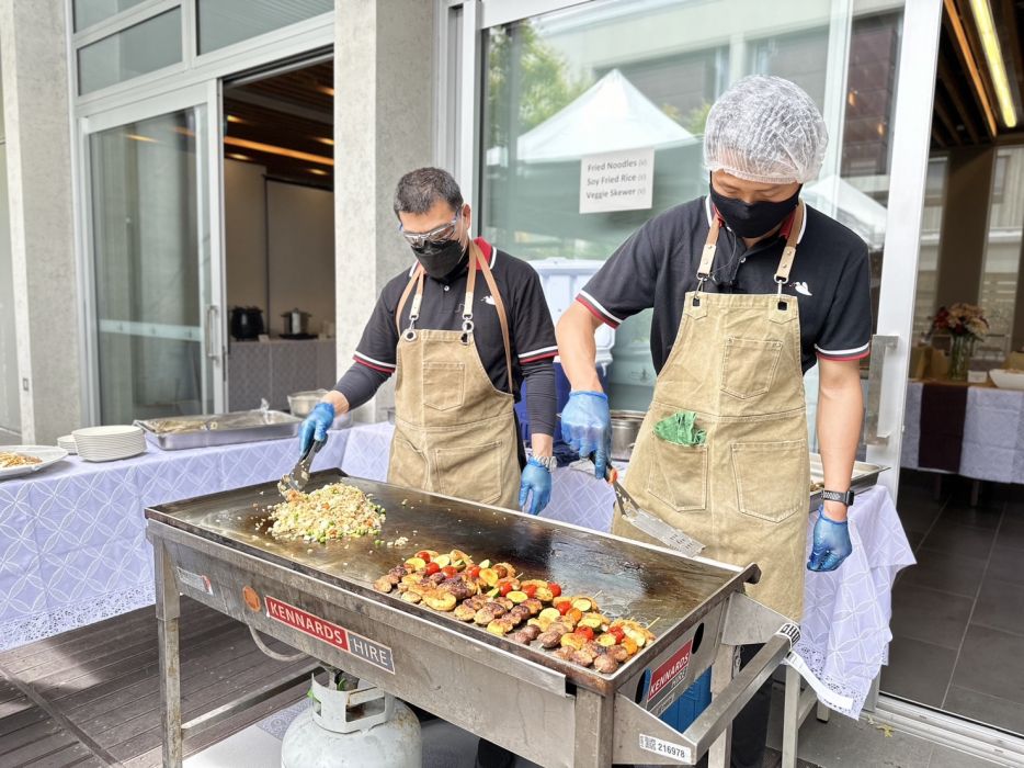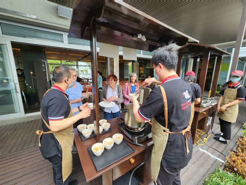 適逢南半球的初夏,鳥語花香、微風送爽,開放式的庭園高朋滿座。活動當天道場提供近40道素食佳餚,除了中西合併的主食選擇,各式飲料、還有自製甜點及創意小吃料理,讓參與者吃得健康,歡喜又滿足。現場也設置現點現做的攤位,當服務人員送上熱騰騰的美食,食客們不禁驚喜感動,從中也感受道場用心「給」出歡喜,「給」出服務的熱忱。