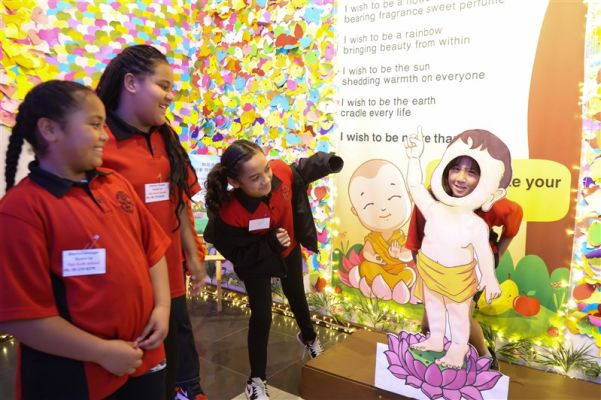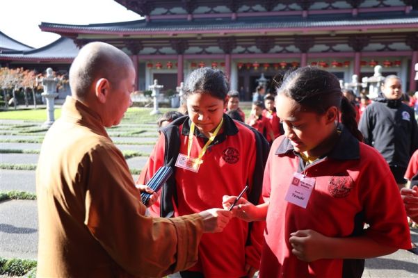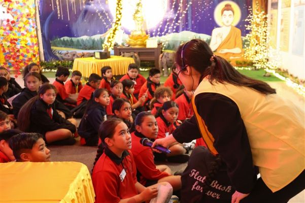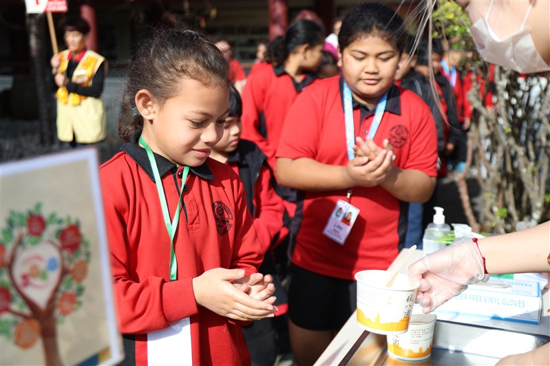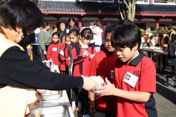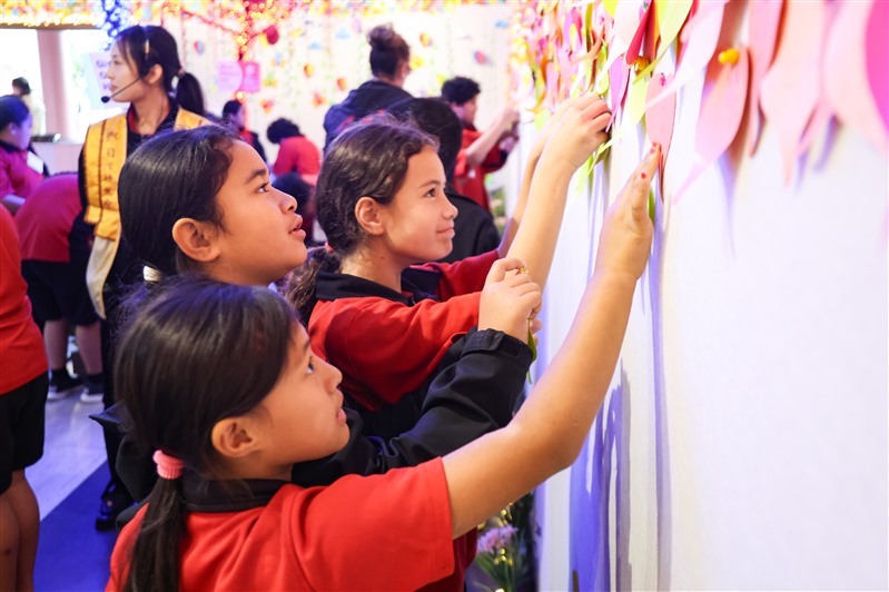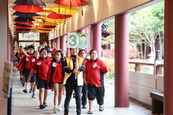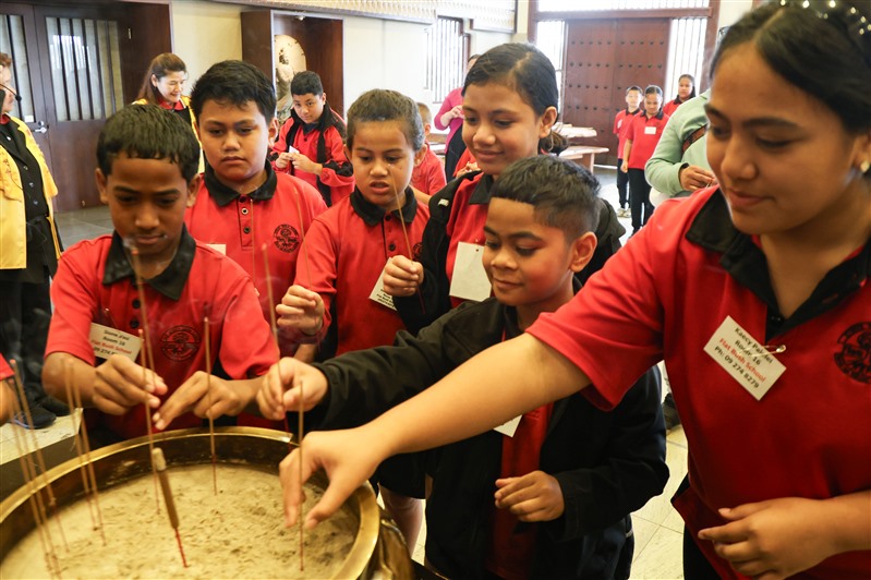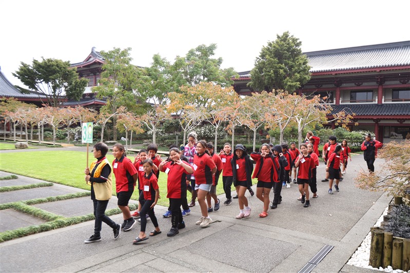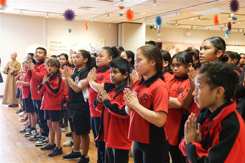 紐西蘭北島佛光山「第十屆三好四給人間佛教文化節」於5月15日迎來第17、18場活動,奧克蘭東區Flat Bush Primary School 的270位師生在校長 Mr Banapa Avatea帶領下前來參加。 紐西蘭國會議員Nancy LU、全國最大警區馬努考區新任行政首長Superintendent Shanan Gray警司、道場所在Ormiston區副局長Inspector Rakana Cook督察也前來關心文化節活動。住持滿信法師、北島協會顧榆齢會長引領下,參觀學生書寫毛筆字、禪坐靜心等活動,貴賓們亦歡喜加入常住法師炒飯行列,為當日學生提供可口的【三好飯】,共同見證「三好四給」理念在社區中的積極影響。