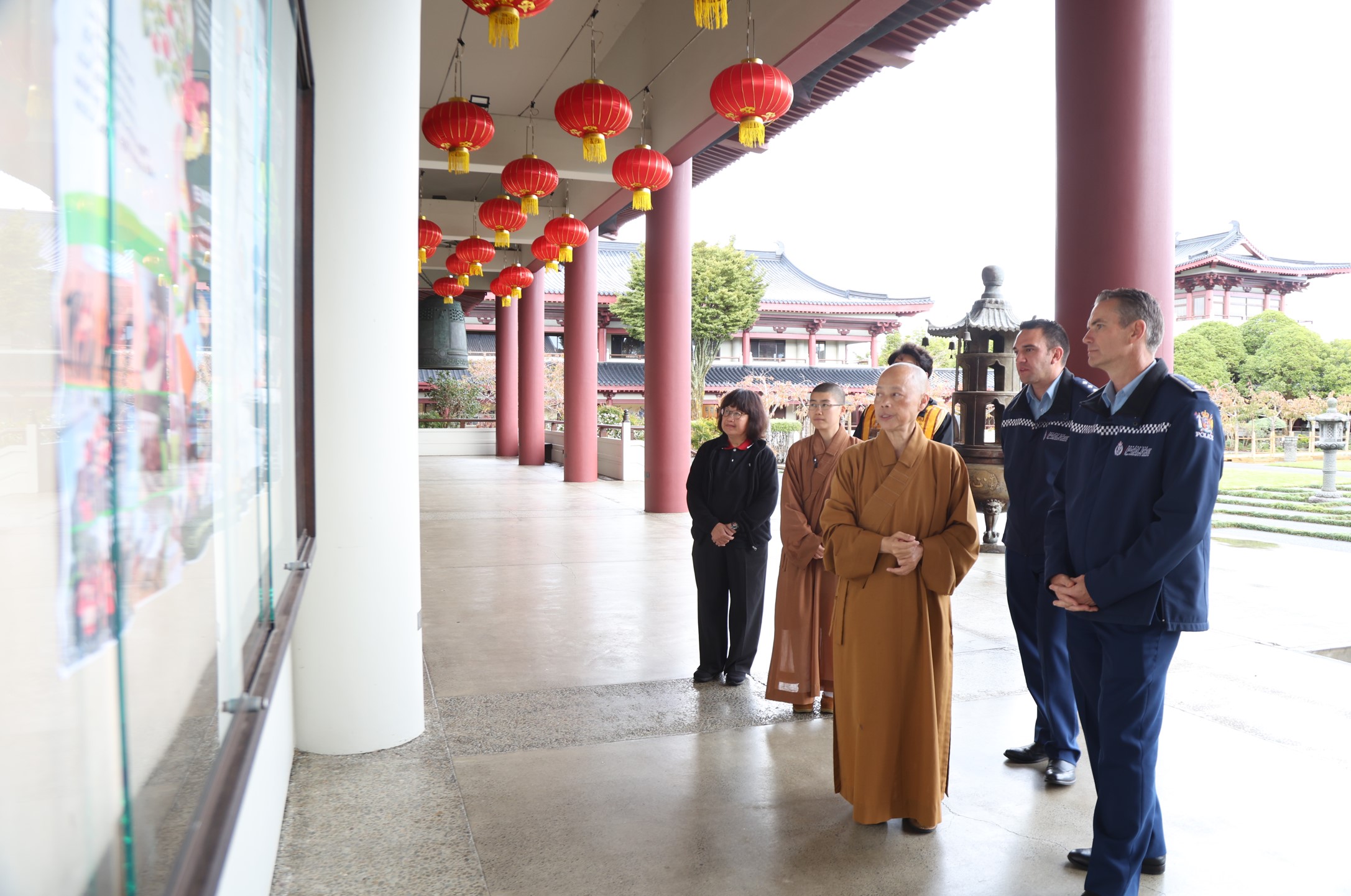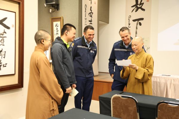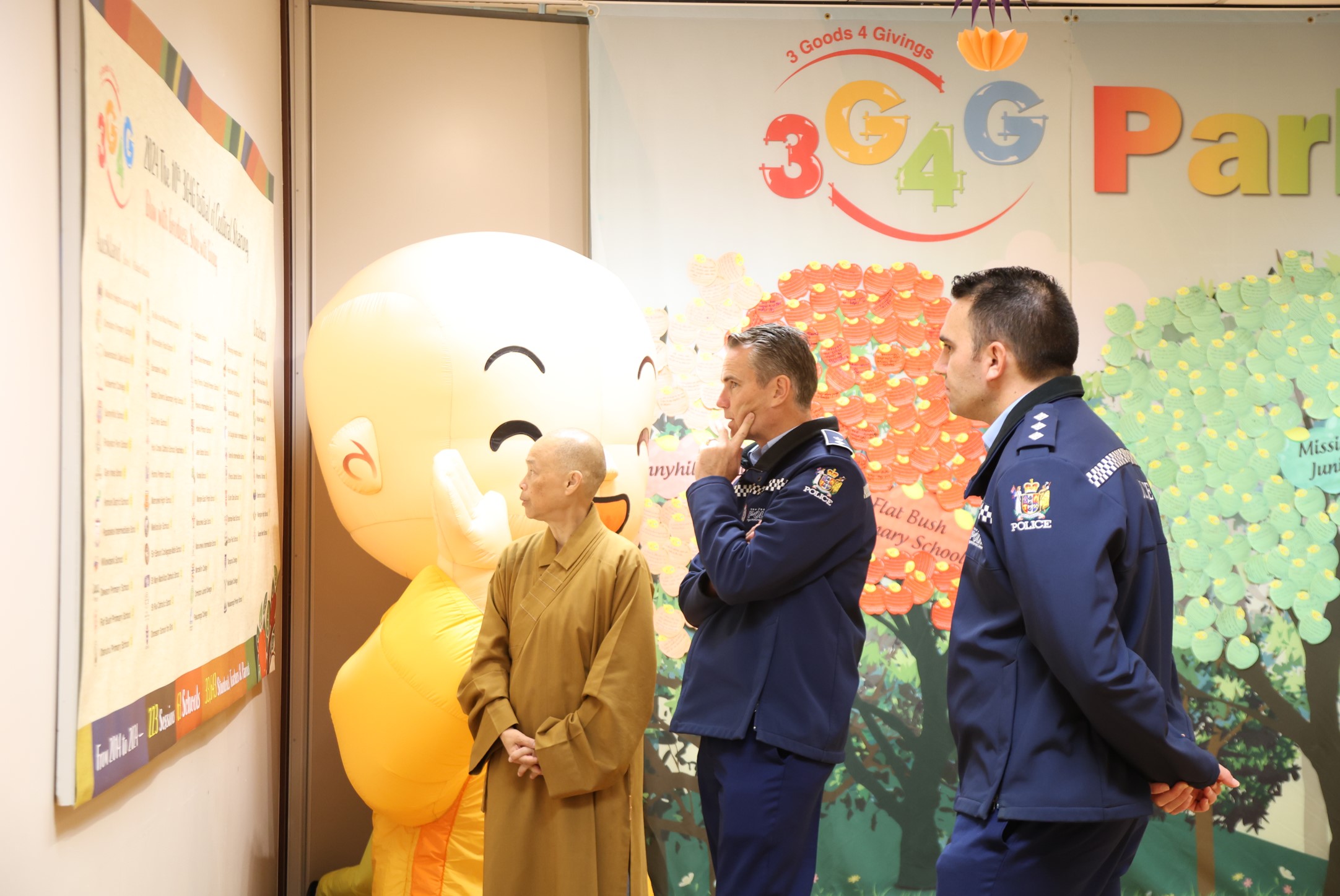 住持滿信法引領Gray警司及Cook督察於大雄寶殿獻花,除了講解於2007年受警署部贈送的毛利祝福綠玉石,也為兩位大警官講說即將於5月底啟建的「梁皇寶懺」法會內容,通過誦讀千年優美的懺文,學習佛陀的智慧及高僧大德的修行經驗,化解我們的煩惱無明以提昇生命品質。警司提出【給人方便】的具體內容,住持表示「給人方便」是一種智慧權巧,是給人助力與服務,幫助解決難題。紐西蘭佛光山多年來不間斷推動星雲大師提出的「三好四給」理念,透過集體創作耕耘社區,讓大眾面對困難時不推諉退縮,感謝警署部給予這活動大力的支持。