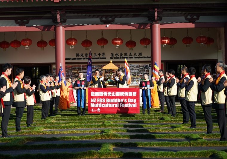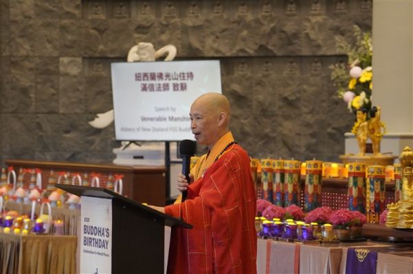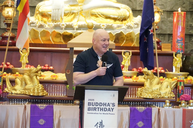 佛光紀元五十九年(2025)4月5及6日,紐西蘭北島佛光山舉辦年度「佛誕節祈願世界和平慶典祈福法會」,紐西蘭佛光山住持滿信法師領眾諷誦《心經》、恭讀佛光山開山祖師星雲大師〈為世界和平祈願文〉。紐西蘭總理盧克森(Rt Christopher Luxon)親臨典禮,與眾一起祈願人心淨化,社會和諧。毛利族長老Kaumatua Tame Hauraki、稱聖靈大教堂司禮長Reverend Ivica Gregurec以宗教儀式為大眾祝禱。大會主席國際佛光會紐西蘭北島協會會長顧榆齡、國會議員Nancy Lu、奧克蘭副市長Desley Simpson、台北駐奧克蘭經濟文化辦事處處長陳詠韶、警署部馬努考區行政首長Supt Shanan Gray、指揮官Inspector Rod Honan、代理警監Supt Trevor Beggs、Howick Local Board主席Damian Light、社區校長等政、教、警界賢達300餘人齊聚大雄寶殿,唱響《紐西蘭國歌》和《三寶頌》同慶佛誕,亦為緬甸地震亡者默哀,願逝者安息,生者平安。