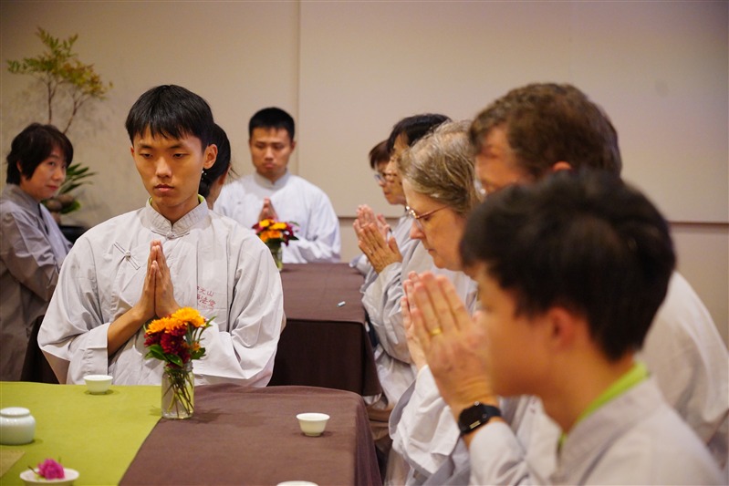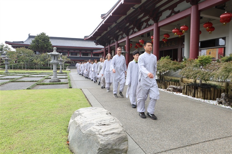 大雄寶殿殿主妙禹法師帶領大眾透過學習毗盧七支坐法與數息觀,引導學員觀照身心,在吸呼間放鬆肩背、沉澱思緒,回到內心最純淨的狀態。青年幹部 Edwin 和 Thomas 引導學員學習佛門過堂儀軌進行午齋。從端碗、觀食、誦偈正念感恩中進食。學員在茶禪中學習觀茶、聞香到啜飲,法師引導在每個動作中保持專注與覺察,從一杯茶去感受禪意,體會生活中的細膩與清明。