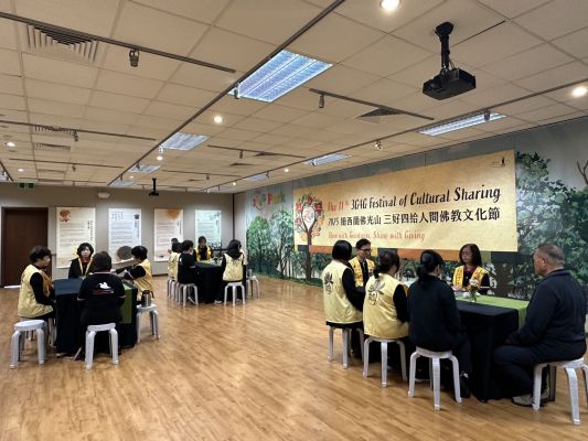 首先,在香雲堂充滿禪意的燈光和輕柔的音樂聲中,茶禪行者的帶領學員放鬆身心、安住靜坐,體會每一杯茶所帶給六根的感受和個中的和合因緣。接著,由學員輪流朗讀「散播快樂」文章內容並分享自己的感受與體會。大師的佛光菜根譚指出「為人服務者,總散發光熱;利益別人者,總散播快樂;對人友愛者,總給人歡喜;幫助別人者,總給人溫暖。」,說明獲得快樂最好的方法,就是幫助別人快樂。