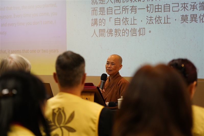住持滿信法師指出實踐人間佛教需要開發思想,突破故步自封的框架;人間佛教的精神是開發自我生命的價值,自我提升以成為自己生命的主人;承認「我是佛」以為自己的生命負責。人間佛教的信仰是傳承佛陀證悟緣起中道的真理,把自己融入到大眾中互相成就,創造善美的因緣。住持鼓勵大眾要肯定自己的佛性能源,人間佛教指出在進化論裡的生命是有優勝劣敗的,透過平日的承擔,磨練,學習空性的思想,開發自己的智慧,豐富生命的養份,開發潛能挖掘出生命的鑽石,待塵盡光生而照破山河萬朵。